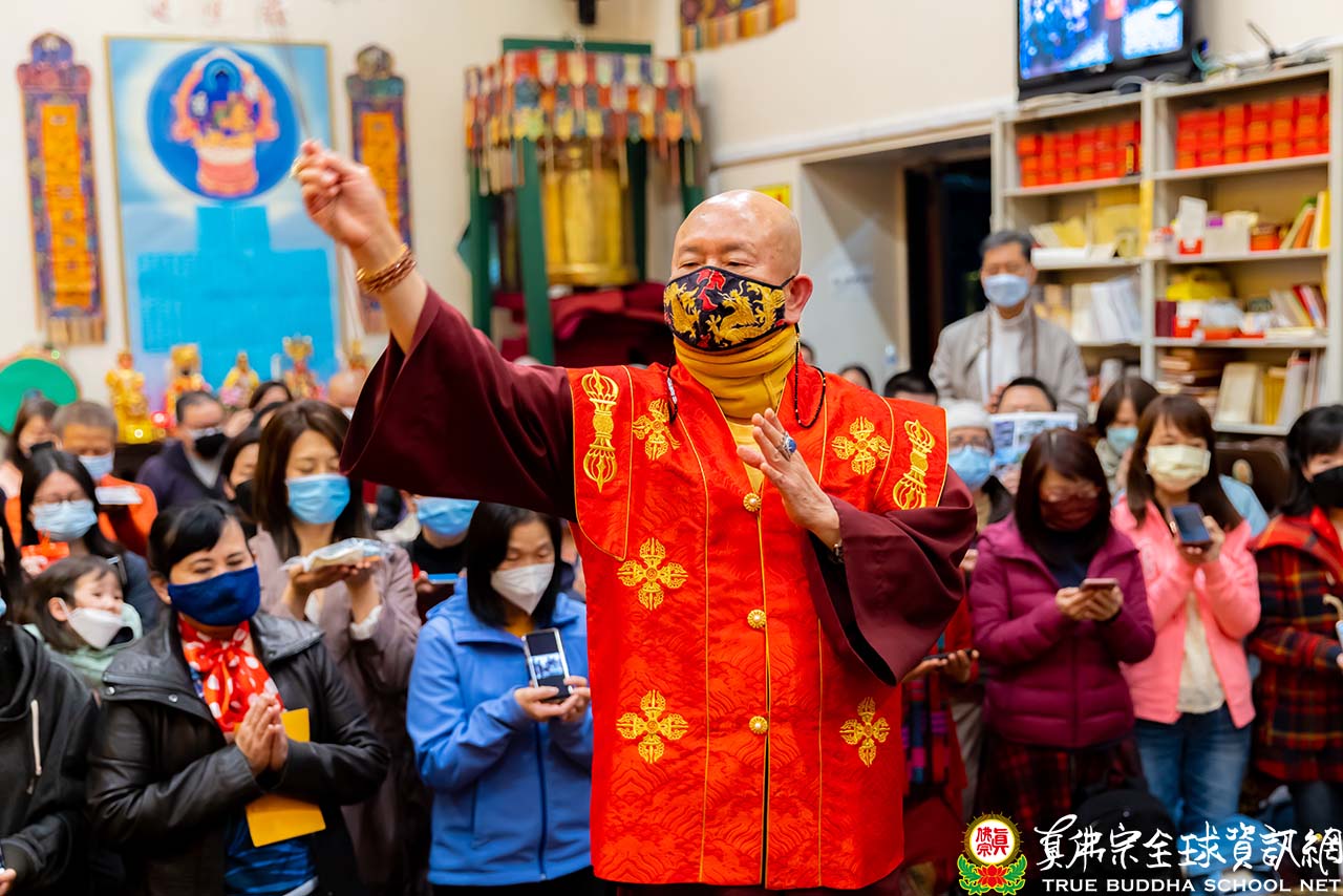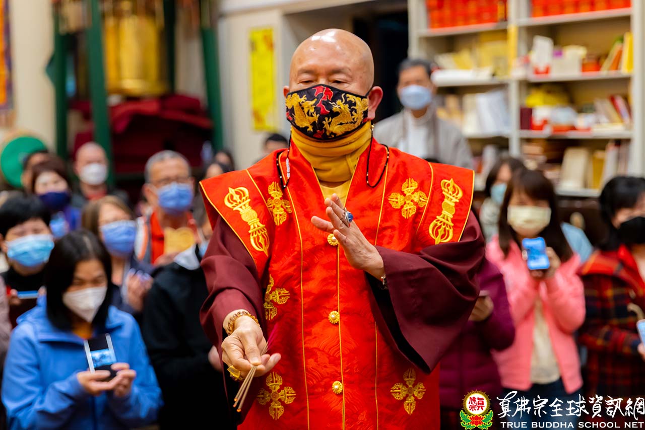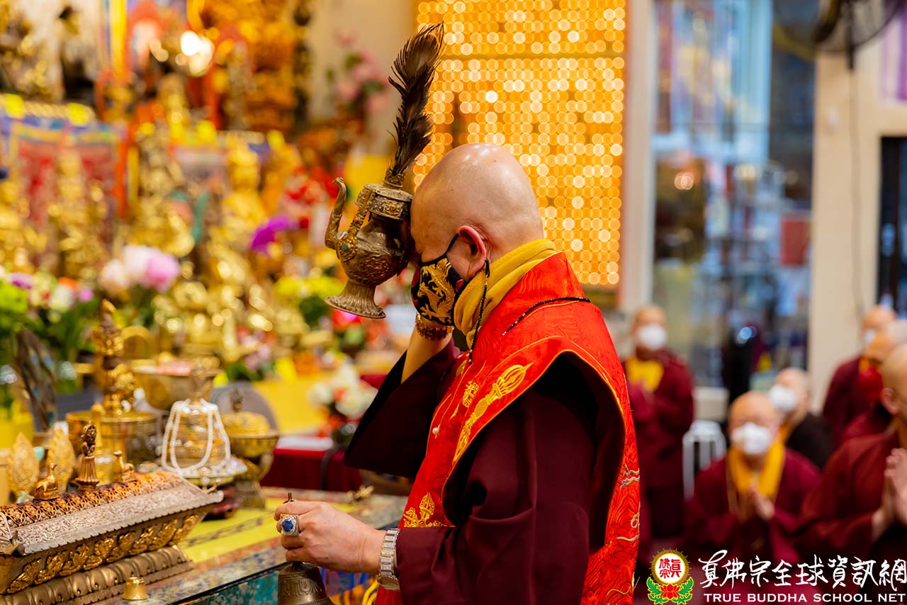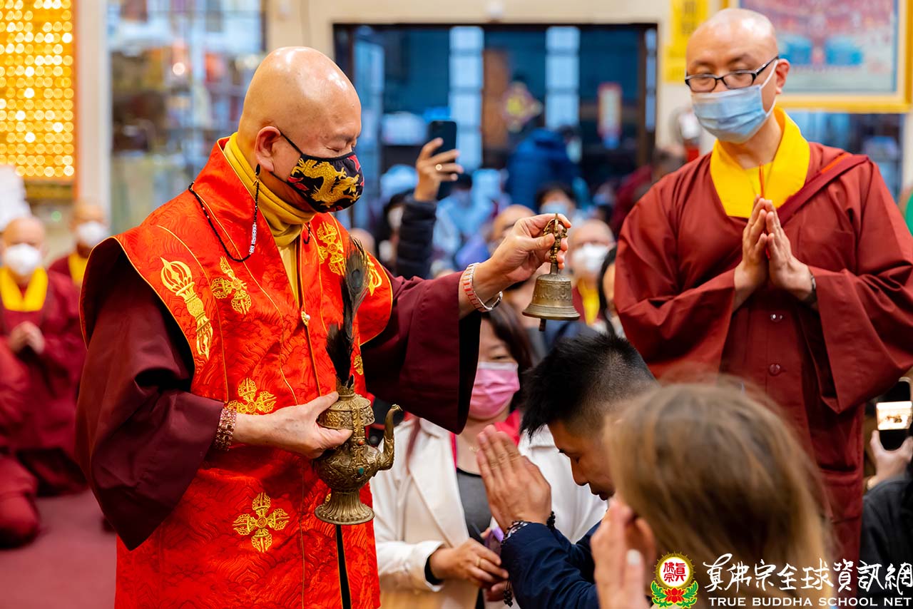 精彩寶貴的法語開示後,聖尊慈悲賜授新同門皈依灌頂、加持大悲咒水暨開光佛像,並以拂塵一一加持眾人。