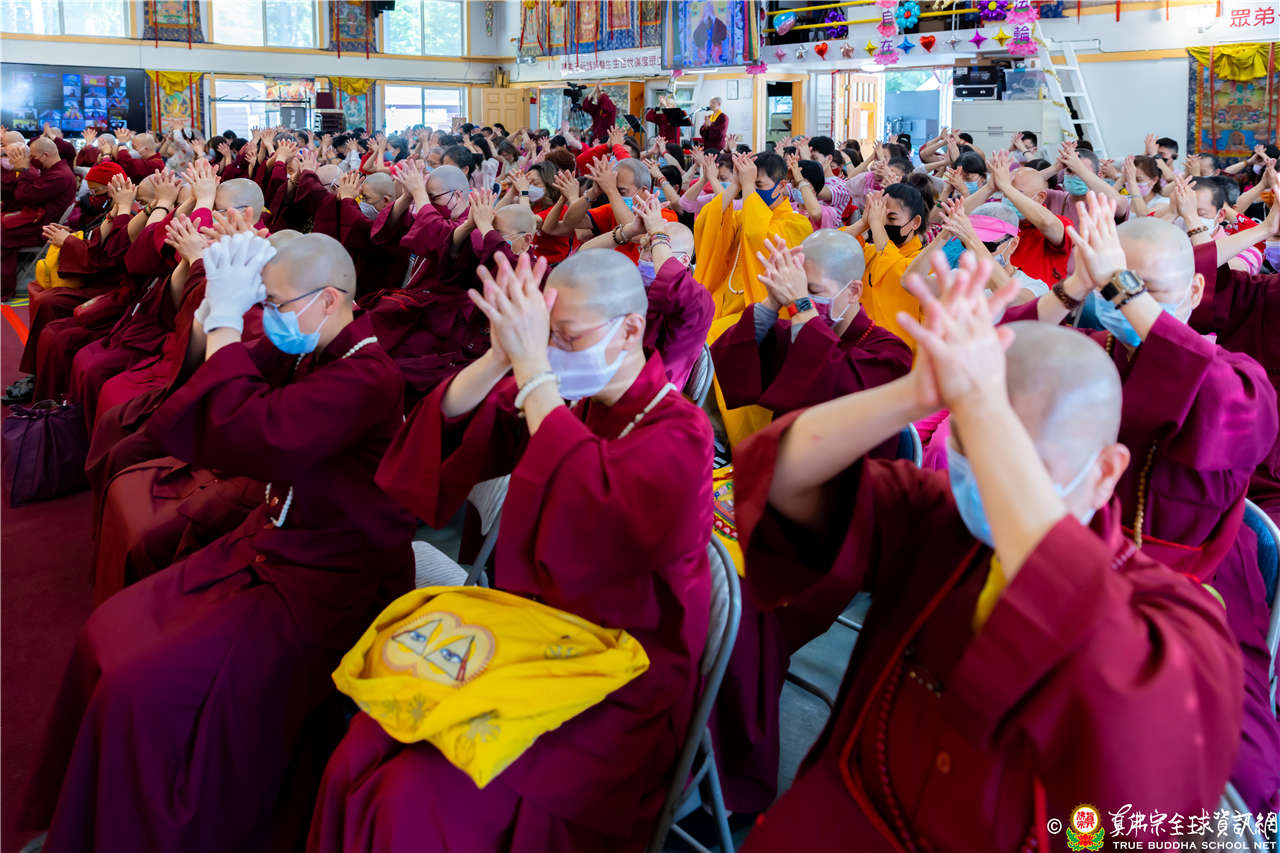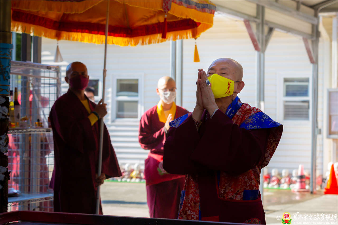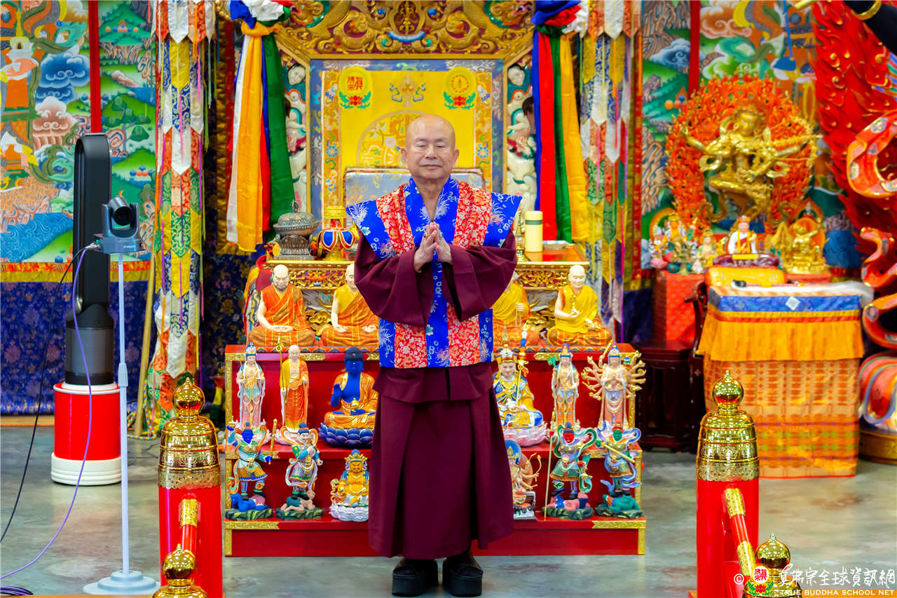 開示完畢後,法王帶領與會大眾頂禮壇城,並與線上同門互動,最後賜予蓮華生大士法灌頂。「南摩蓮華生大士護摩法會」,就此結束。