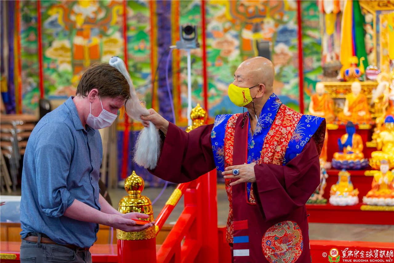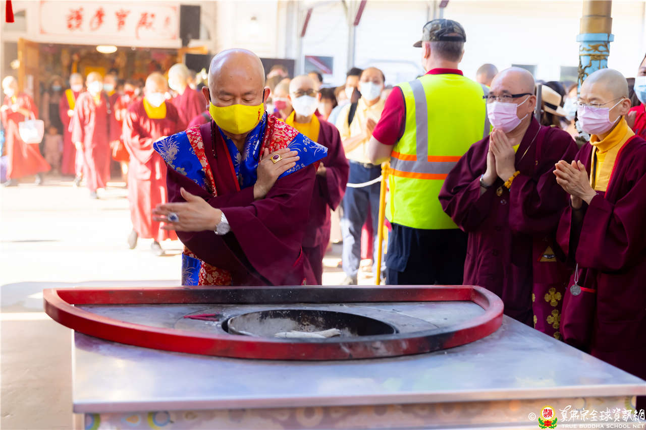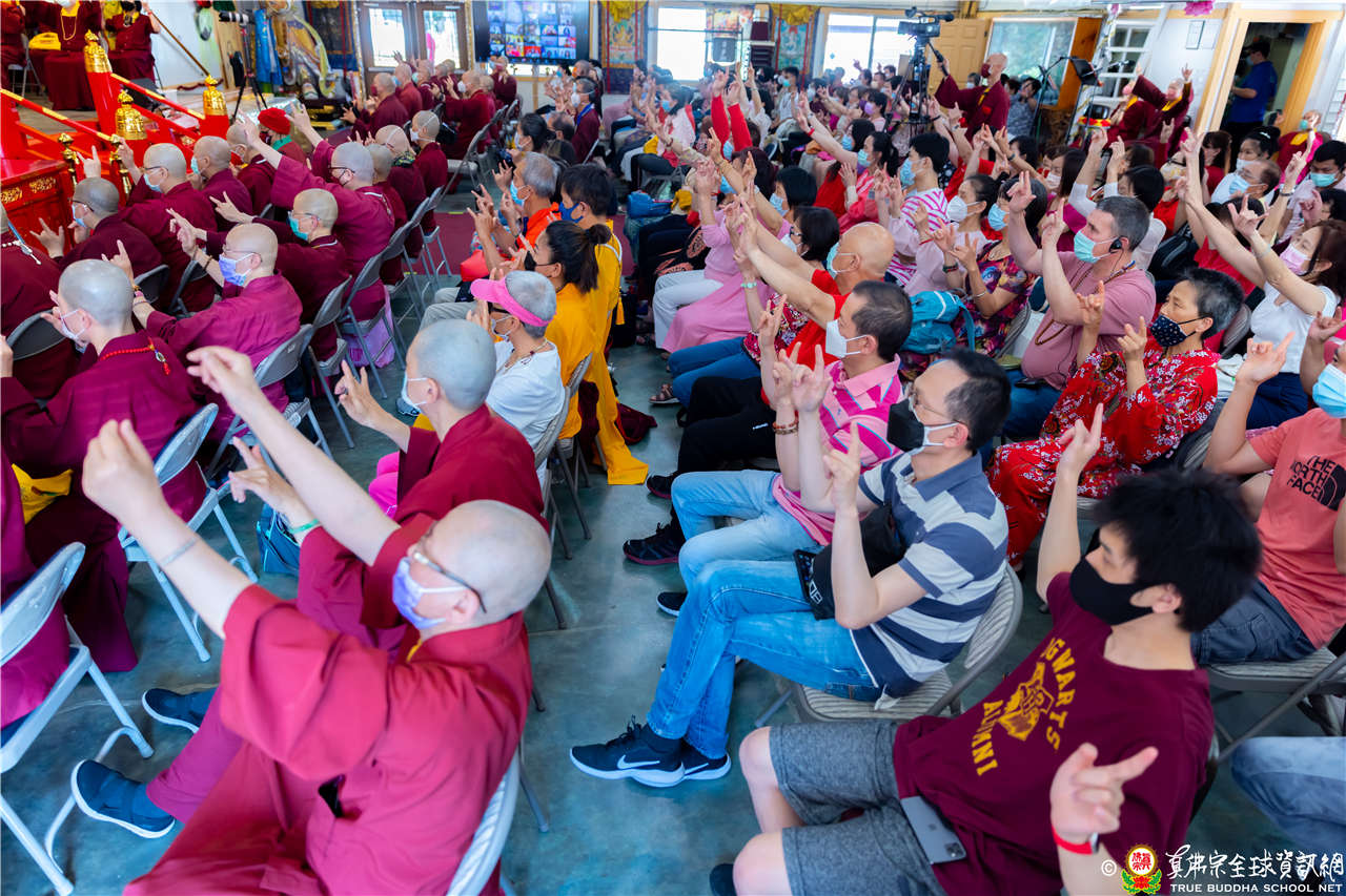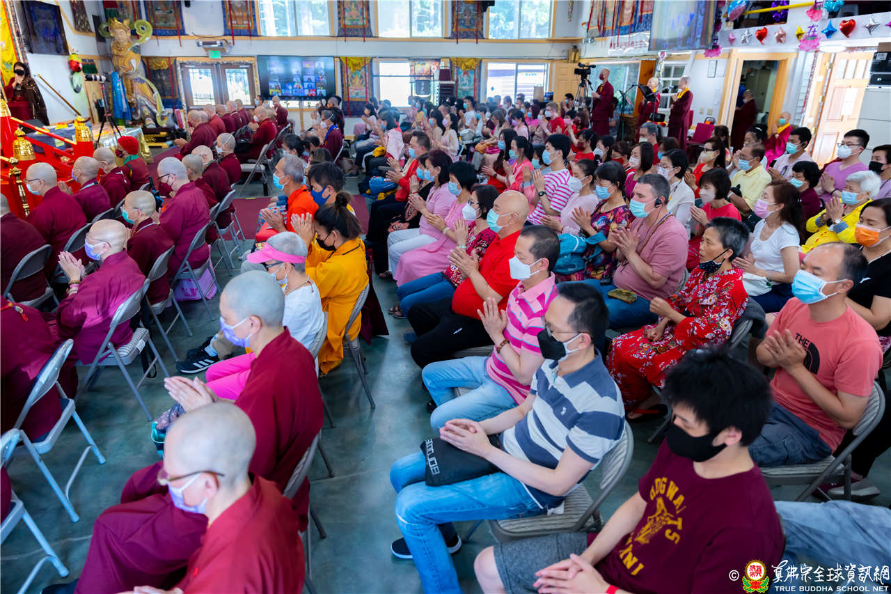 開示完畢後,法王帶領與會大眾頂禮壇城,並與線上同門互動,最後賜予蓮華生大士法灌頂。「南摩蓮華生大士護摩法會」,就此結束。