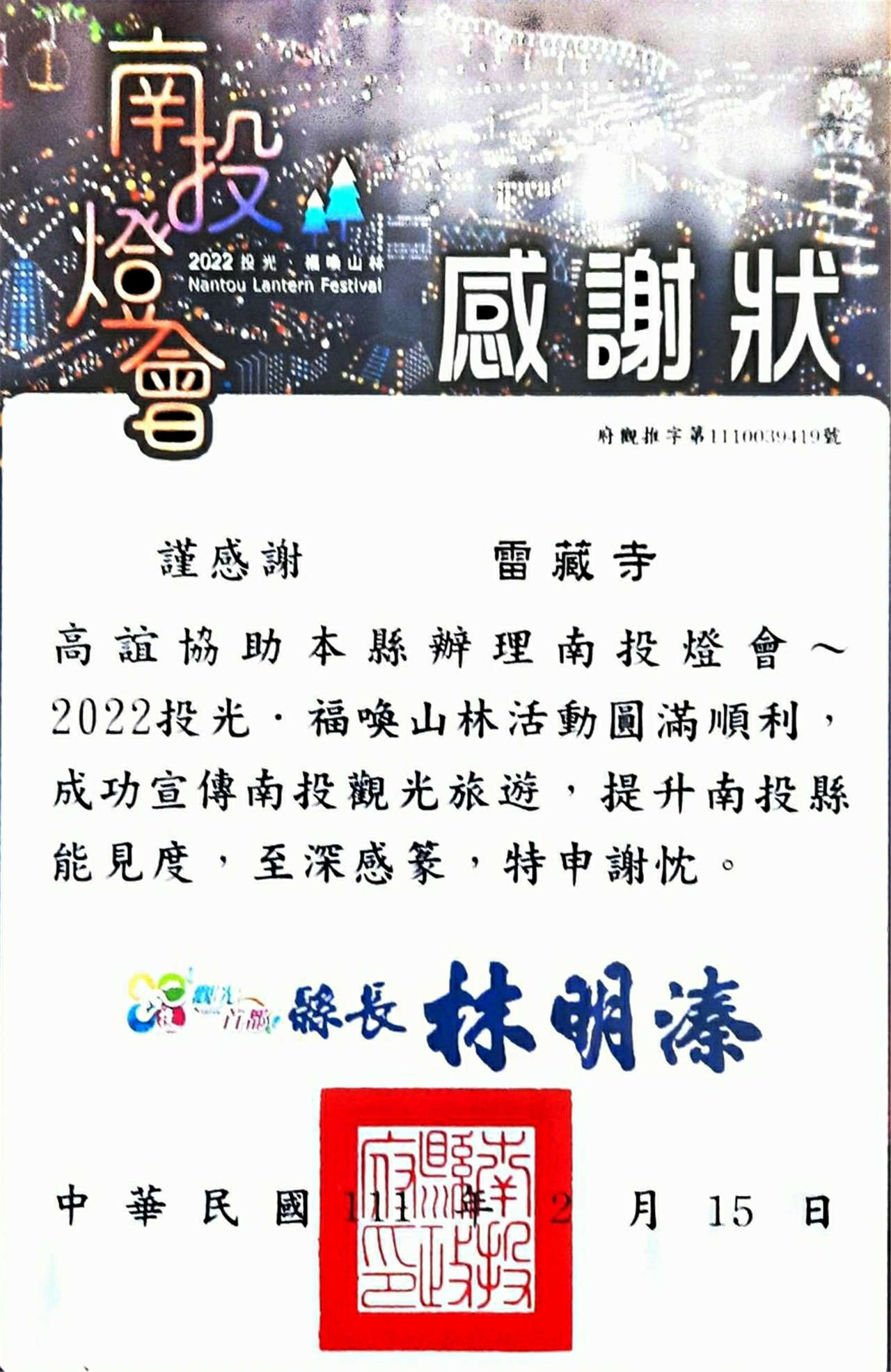 2022年參與宗委會舉辦全球道場「長壽三尊薈供請佛住世」活動,台灣雷藏寺的佈壇設計經票選獲得優良獎。