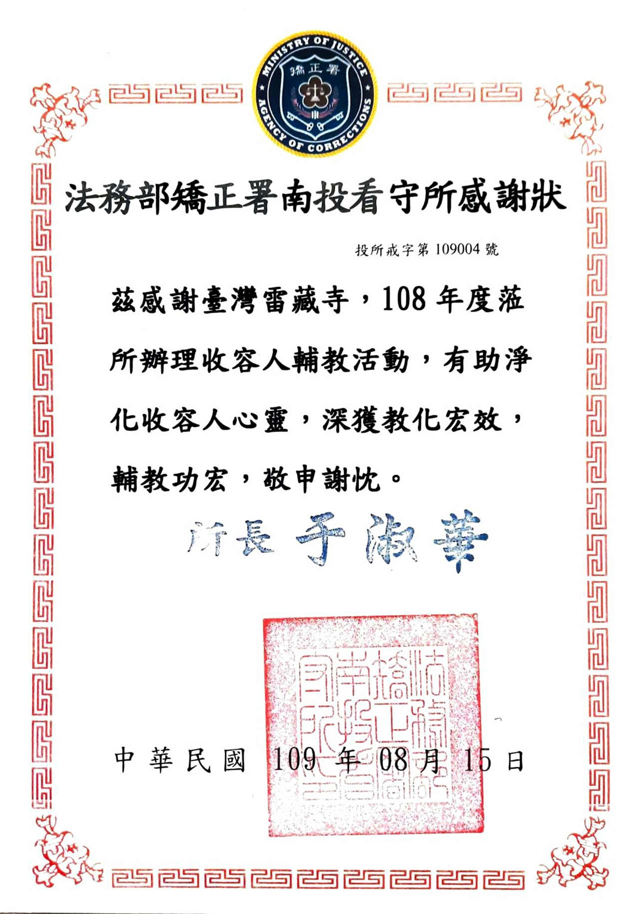 台灣雷藏寺與社會互動良好,所獲頒之感謝狀亦無法一一陳述,舉例有榮獲臺灣宗教百景全民票選活動人氣景觀第六名。提供弱勢家戶生活物資,善行可嘉感謝狀。支持南投縣真佛宗民俗文化嘉年華暨華光盃民俗體育競賽感謝狀。草屯鎮公所頒發熱心公益捐贈圖書,豐富館藏嘉惠鎮民感謝狀。法務部矯正署南投看守所頒發,輔教活動助淨化收容人心靈感謝狀。協助南投燈會感謝狀…等。
