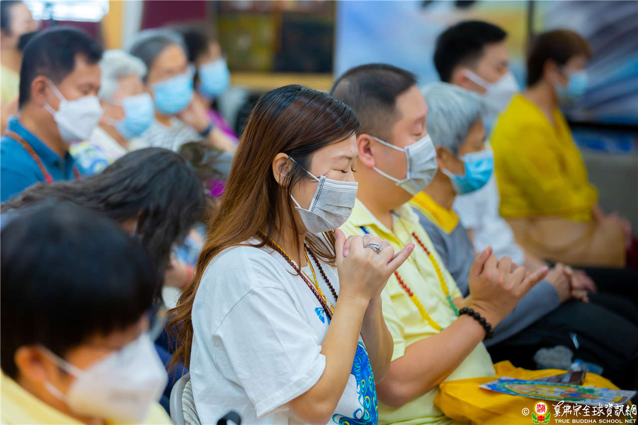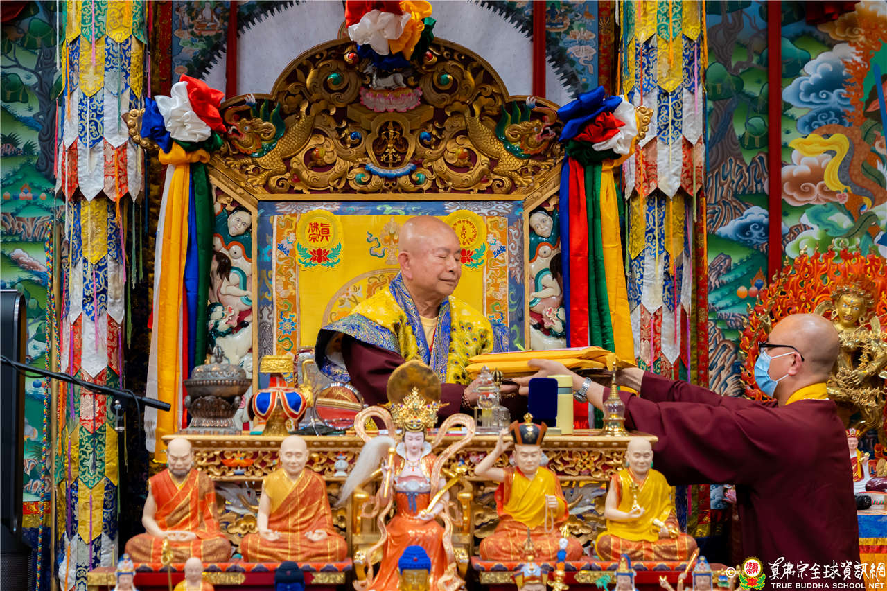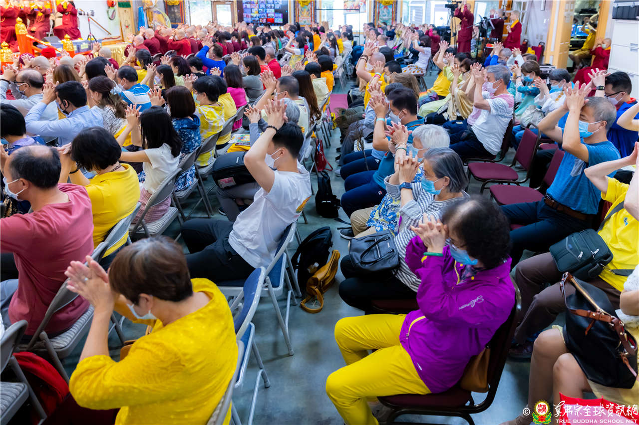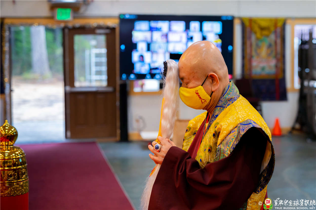 最後法王移駕到Zoom前接受弟子的感恩與祝福,弟子們紛紛在鏡頭前感謝法王。現場眾弟子接受法王的「孔雀明王」灌頂,法會圓滿結束。