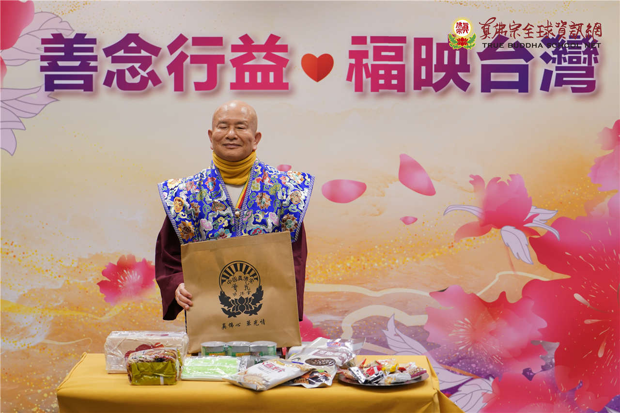 接著,台灣華光功德會邀請法王拍慈善物資紀念照片。法王介紹台灣華光功德會:到目前為止,華光功德會累積幫助的華光小天使一共有三萬人次;全台每個月固定分享約百萬元的物質、每個月為66所學校服務。目前華光小天使人數約有660人,華光功德會提供了民生物資約8千份、捐助了白米24噸。每年濟助弱勢家庭邊緣戶520戶、捐助愛心物資約900份、急難救助總額約百萬元。法王感謝台灣華光功德會的善舉。
