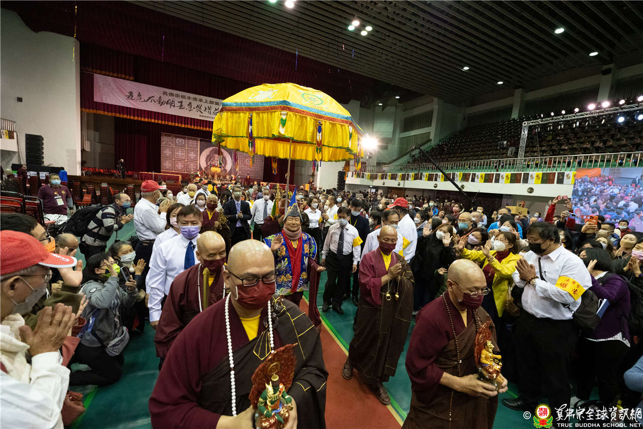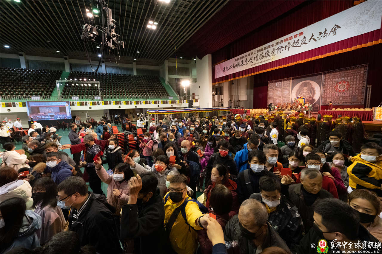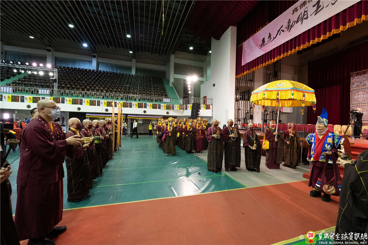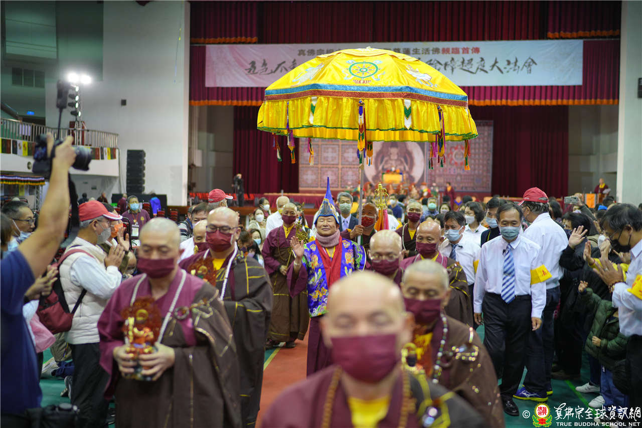 2023年元旦,人人歡喜迎接新一年的來臨。在這人人普慶的一天,台灣嘉義市真佛宗法華堂恭請蓮生法王到嘉義市立港坪運動中心體育館主持「五色不動明王息災增益敬愛除障超度大法會」,首傳「五色不動明王不共大法」。法會現場莊嚴殊勝,台上除了有巨幅的大日如來唐卡,更有金剛界曼荼羅及胎藏界曼荼法相圖。原來「不動明王」是八大明王首座,也是金胎兩部部主「大日如來」的變化身及教令輪。下午兩點,法會開始,大會迎師組恭迎蓮生法王入道場。