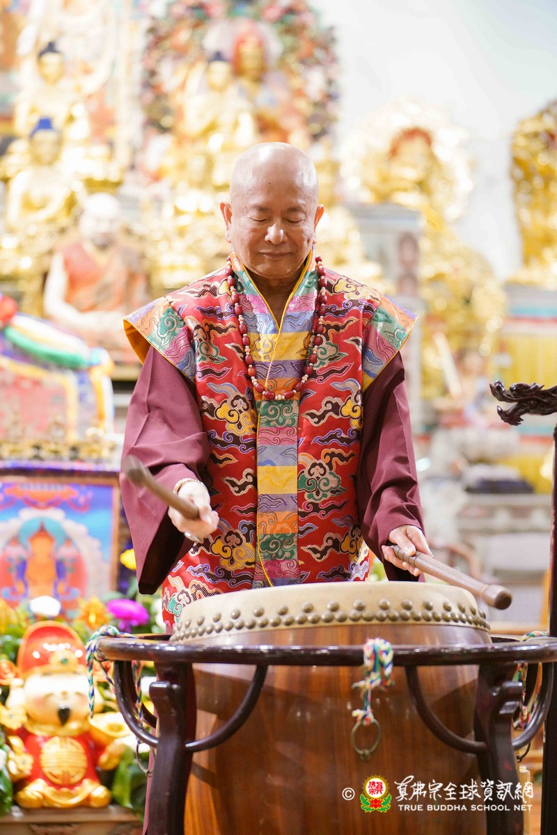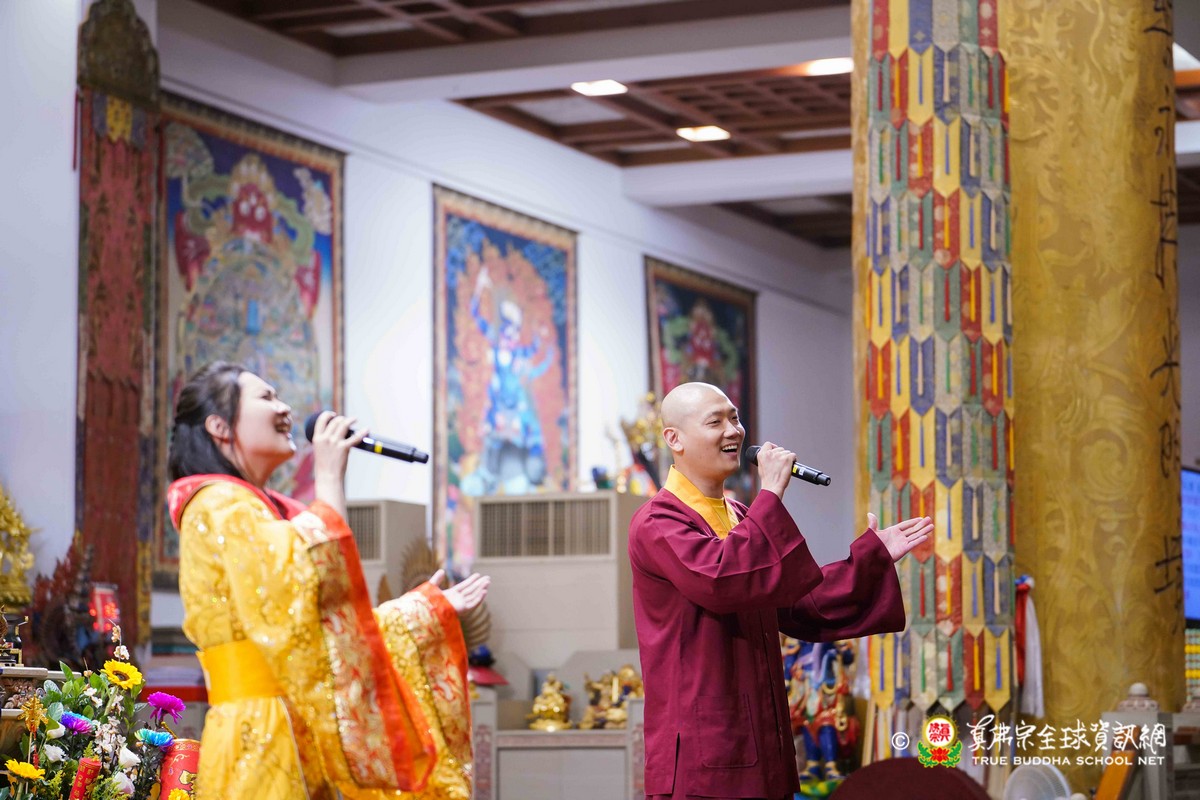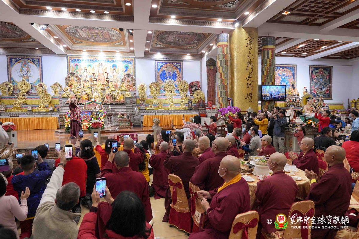 師尊在用餐期間還巡視各桌,也以吉祥鼓、金剛棍表演加持大家!台灣雷藏寺更特別準備精彩的年節之節目,由蓮花素任助教與豆豆師姐主持!現場氣氛非常的溫馨熱烈!