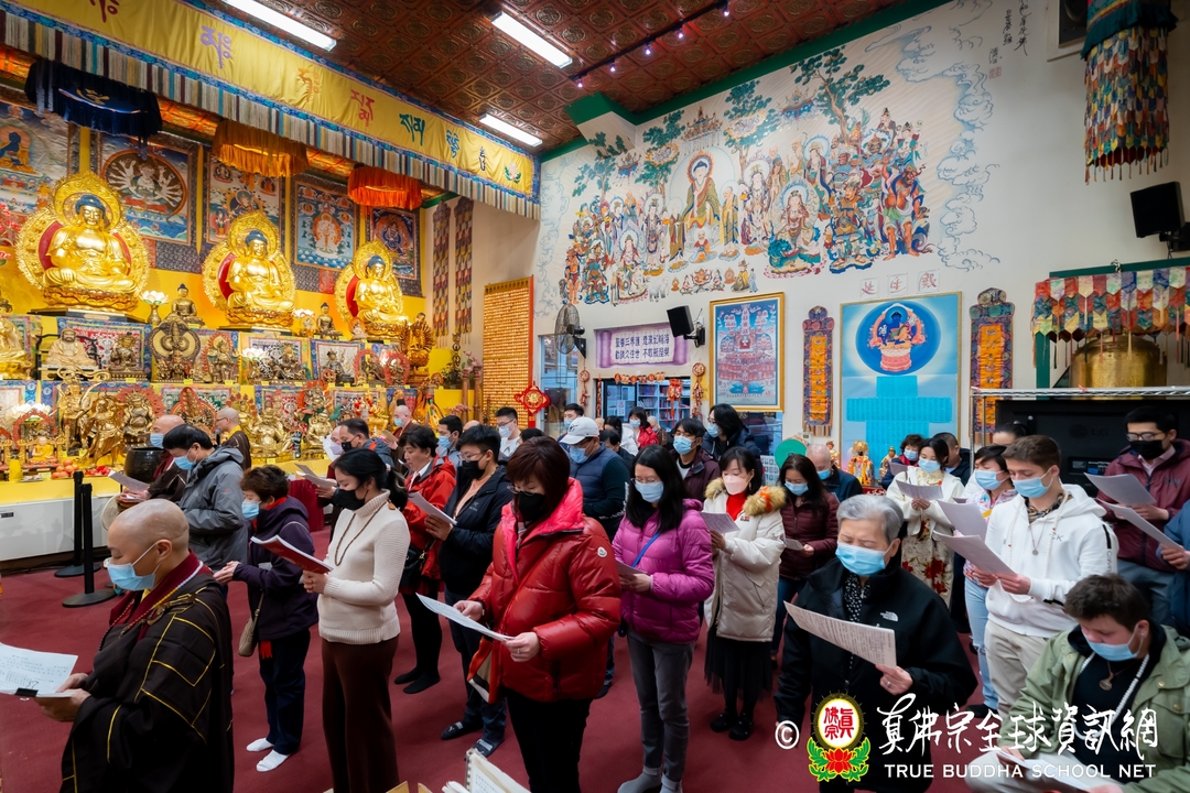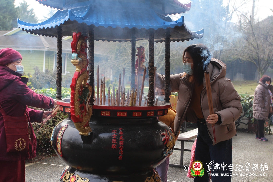 人潮不斷湧入大雄寶殿,全寺幾乎塞滿了上香禮佛的人,大家不怕夜黑,誠心前來西雅圖雷藏寺禮拜諸佛菩薩金剛護法神眾。到了晚上十點半,佛前大供儀式正式開始,丹增加措仁波切和住持蓮吟法師帶領唱誦,蓮明法師敲打鐘鼓,梵聲悠揚,完美地搭配著樂器,眾人很快進入狀態,莊嚴而專注地跟唱佛號佛咒與佛經讚偈,祈求諸佛菩薩加持眾等心想事成。佛前大供結束後,住持蓮吟法師和丹增加措仁波切、眾法師們率先到廟前的香爐上頭柱香,所有大眾滿心歡喜地跟著一同上香,為新的一年祈福許願。最後每個人臉上都掛著滿意的笑容,帶著供品開心地回家,儀式圓滿落幕。有的同門意猶未盡的燃燈供佛,跪在壇城前虔心祈求佛光注照新的一年吉祥如意,有的同門繼續歡聚在一起,留在廟裡跨年夜。法師們不辭辛勞的全天招待香客,一直忙到淩晨兩點才結束。