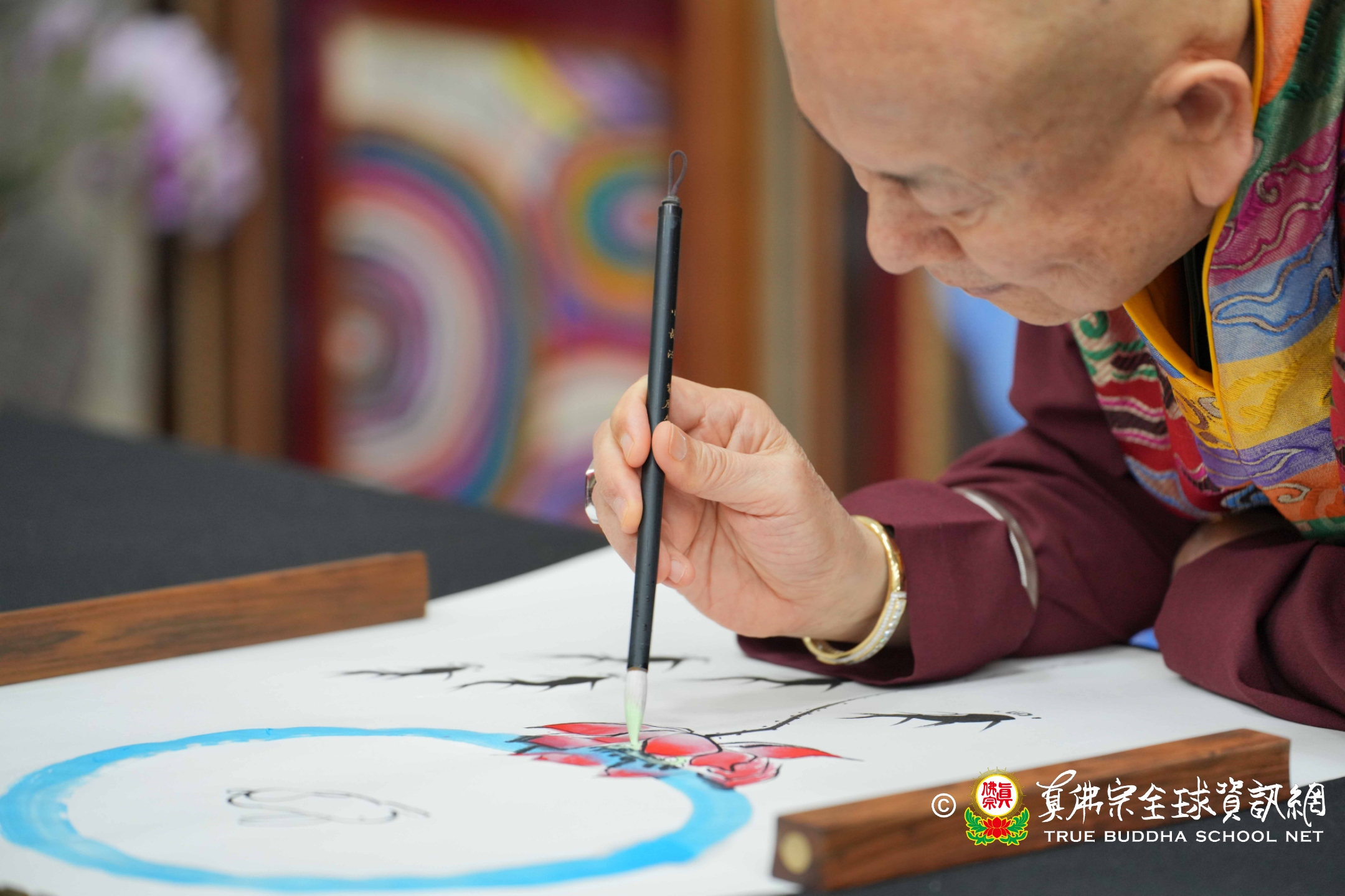為了迎接新春,法王的畫作非常應景:畫中有兔子、蓮花、池塘和魚,寓意「兔」飛猛進、年年有「魚」。法王在採訪中表示「兔子是最平和的動物,希望在這一年,大家都能夠很平安的度過去。同時法王也揮毫寫下「鴻兔大展」,給予大家新春吉祥的祝福。