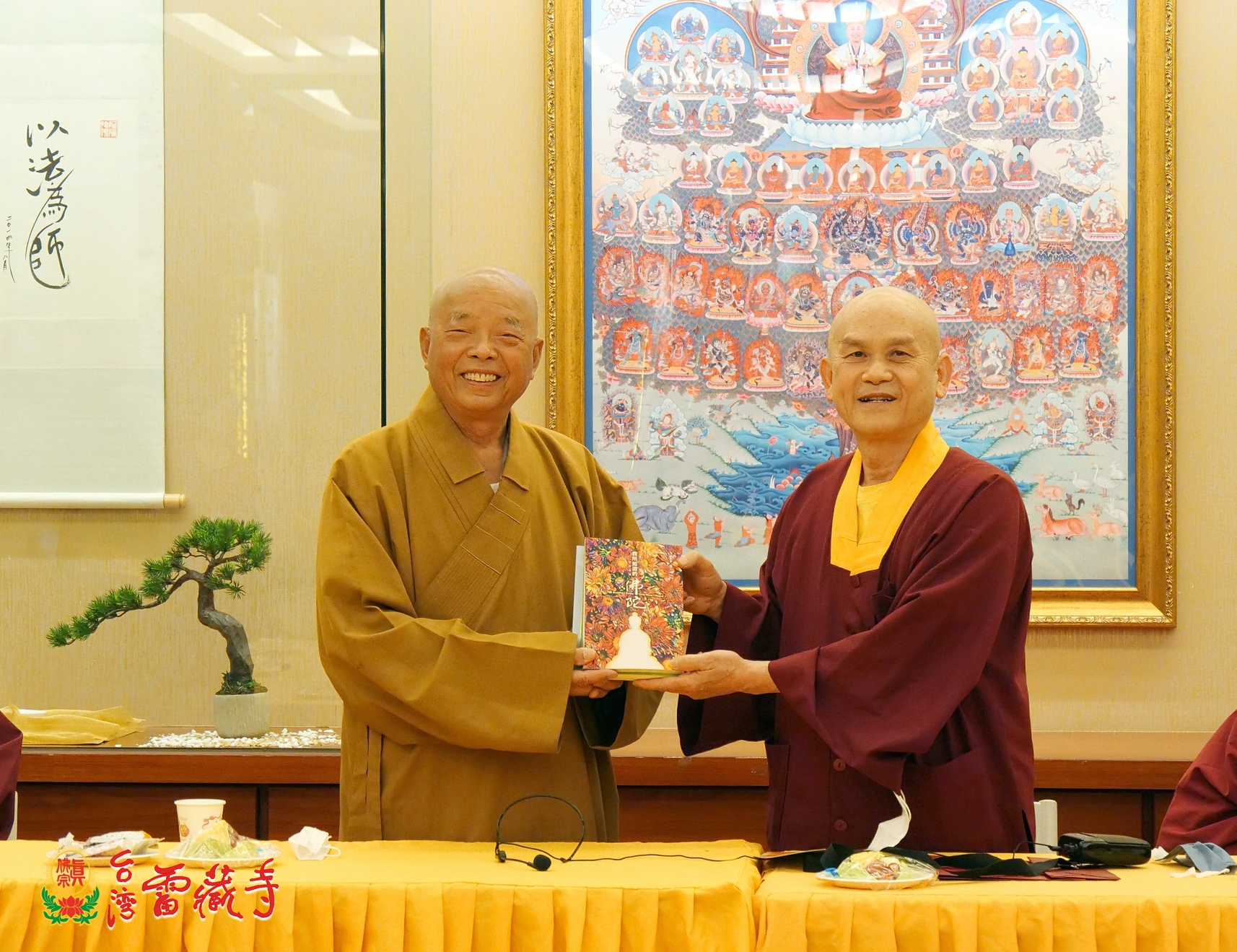 席間,釋慧龍法師代表向台灣雷藏寺致贈星雲大師的法語書籍、佛光刊物「人間福報」及烏龍茶禮盒,以表對於前來拈香的感謝;同時,台灣雷藏寺住持也回以真佛宗根本上師蓮生活佛的著作文集作為回禮。