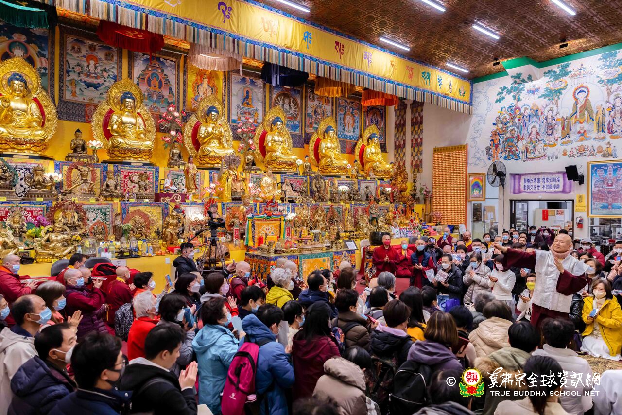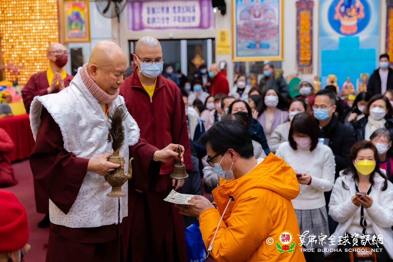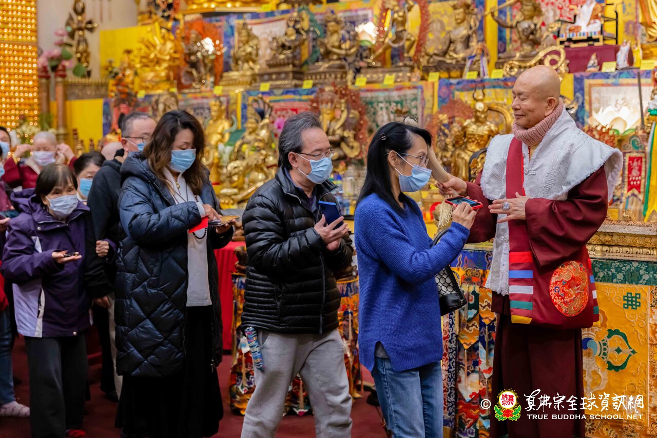 聖尊精彩寶貴的法語開示後,慈悲為新皈依弟子做皈依灌頂,並加持大悲咒水、開光佛像,及持拂塵加持與會眾等,大眾法喜充滿,信受奉行。