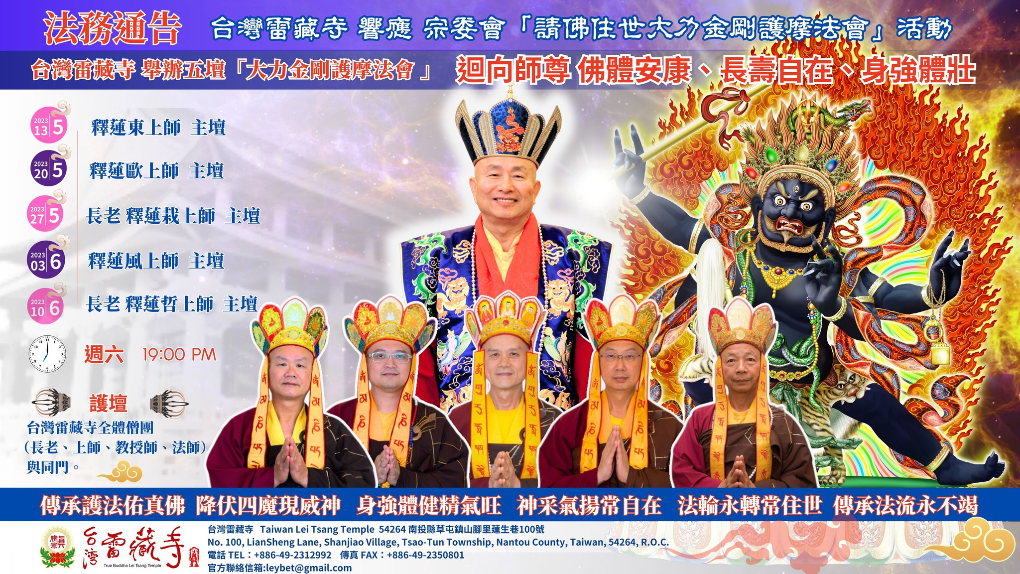 台灣雷藏寺響應宗委會發起的「恭祝 聖尊蓮生活佛佛誕」,啟建「 大力金剛」護摩暨全球弟子持誦「大力金剛心咒」請佛住世活動。持續兩周大力金剛專壇護摩法會,本周5月27日邁向第三壇,由長老釋蓮栽上師主壇迴向:聖尊蓮生活佛,佛體安康、長壽自在、長住世間、恆轉法輪。