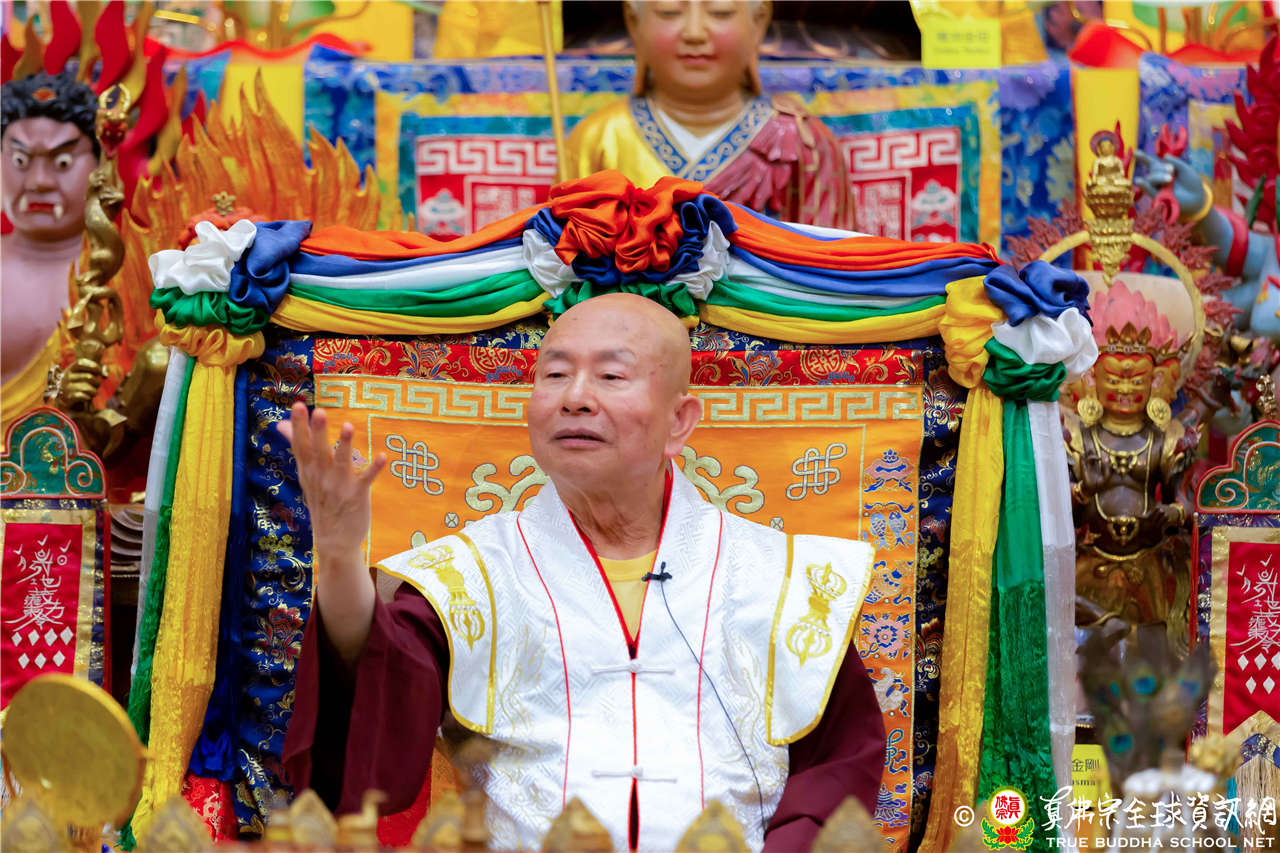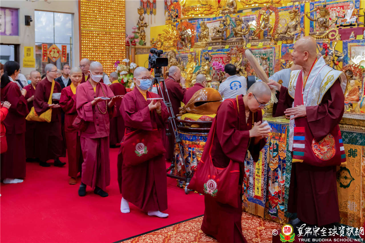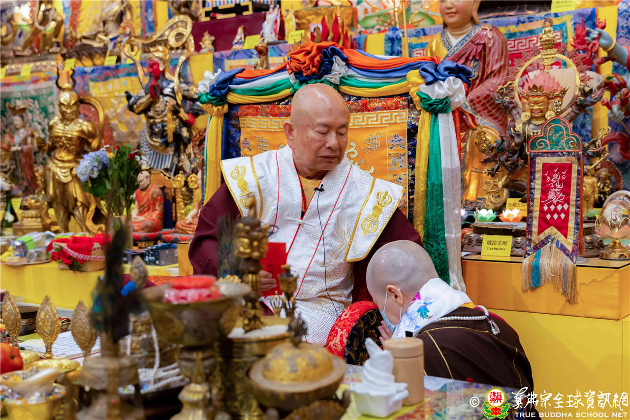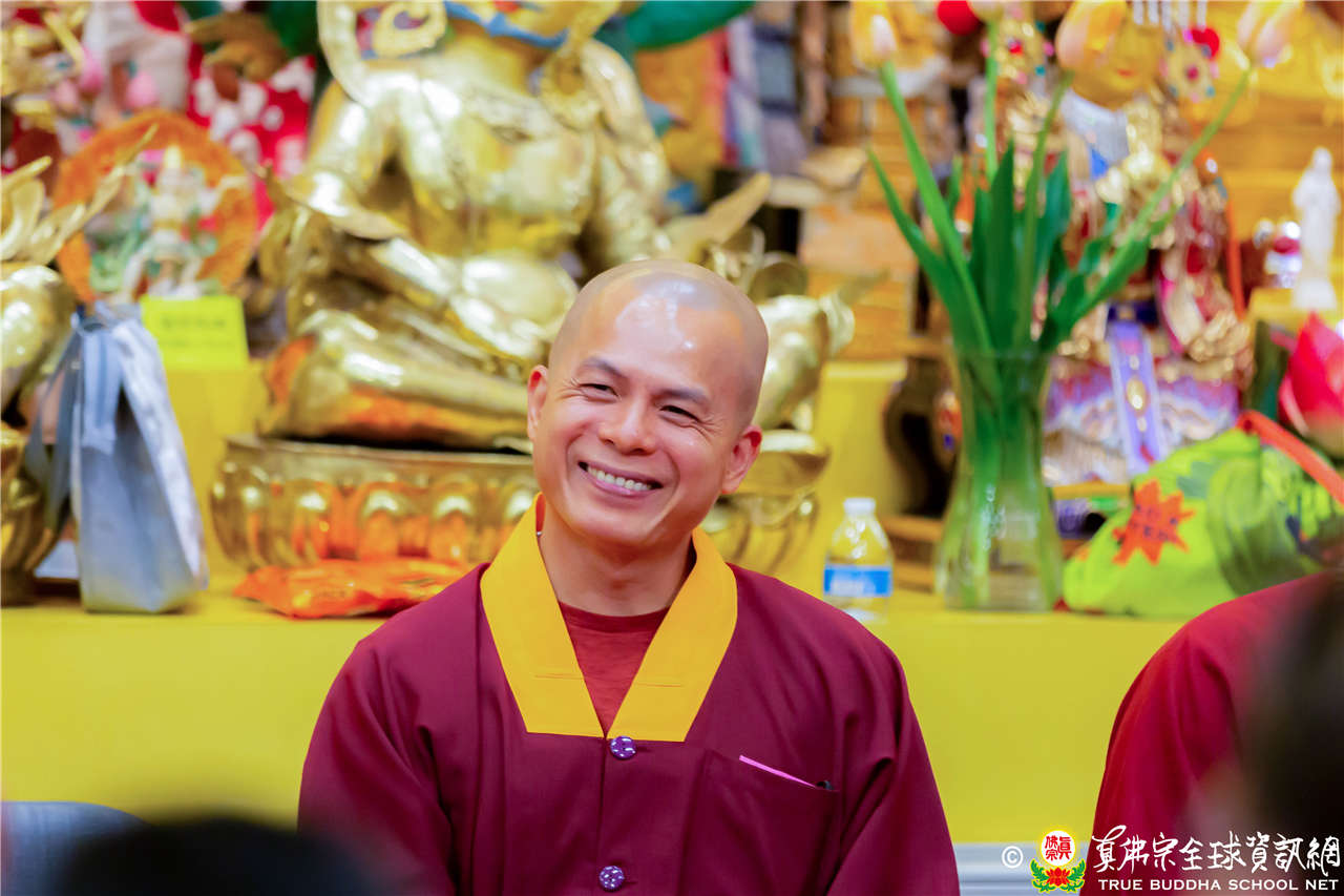 聖尊結束精彩寶貴的法語開示後,慈悲為新皈依弟子做皈依灌頂,並加持大悲咒水、開光佛像,及持拂塵加持與會眾等,大眾法喜充滿,信受奉行。
