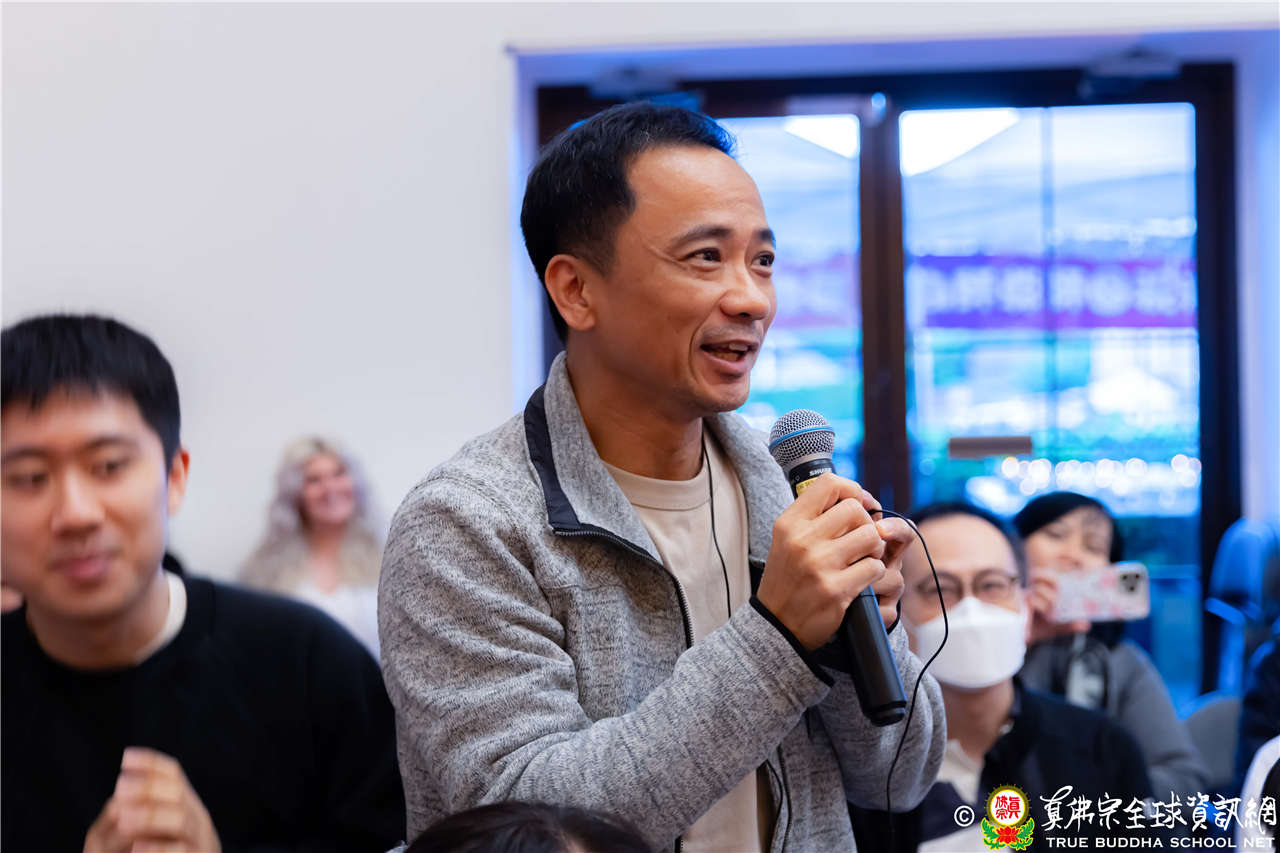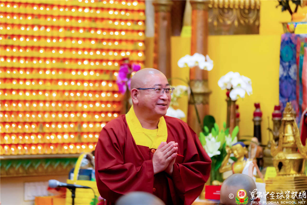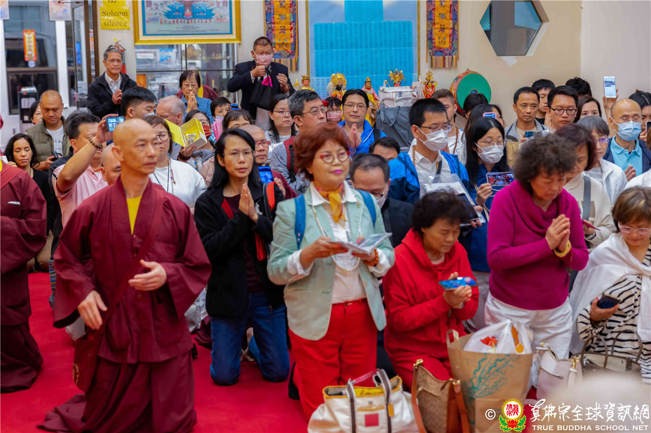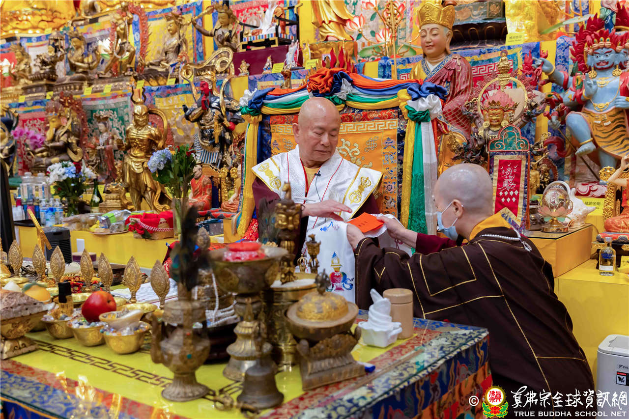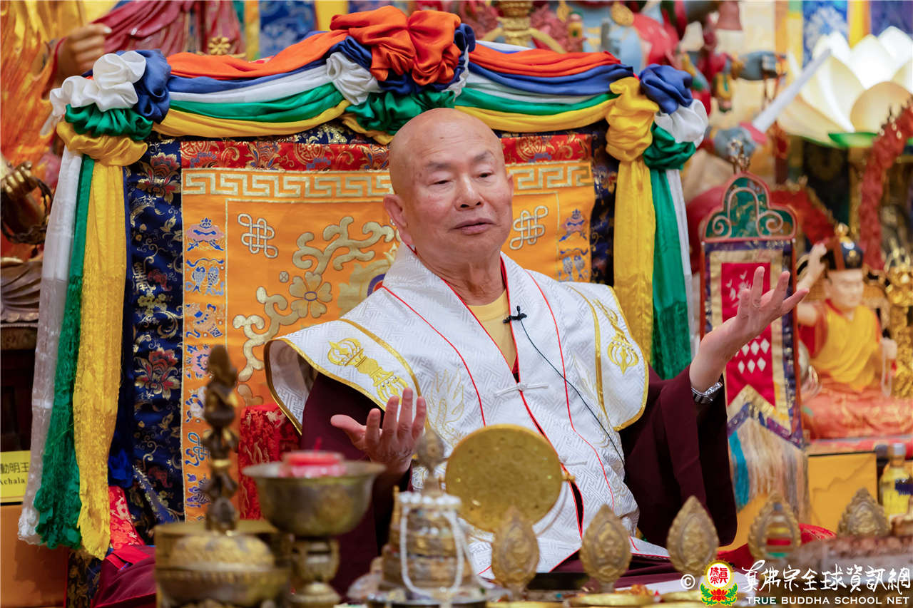 聖尊結束精彩寶貴的法語開示後,慈悲為新皈依弟子做皈依灌頂,並加持大悲咒水、開光佛像,及持拂塵加持與會眾等,大眾法喜充滿,信受奉行。