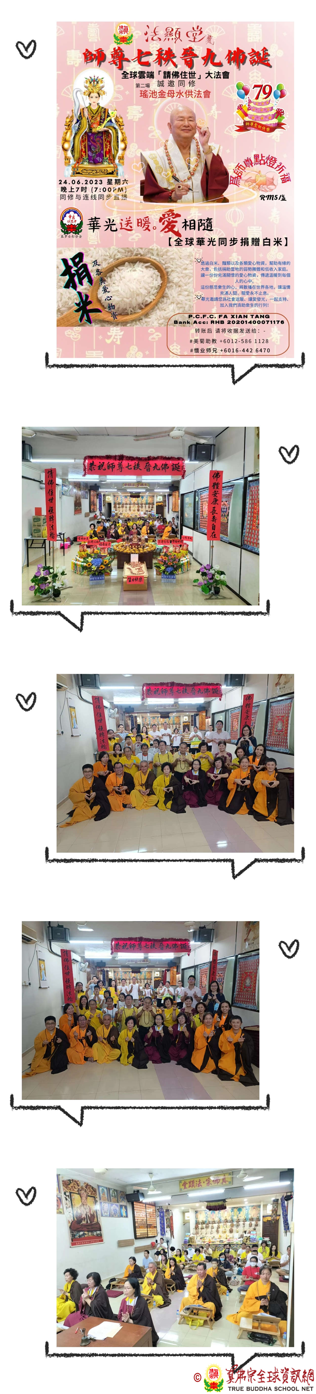 2023年6月24日馬來西亞法顯堂薈供/水供法會圓滿殊勝 2023年6月24日,在真佛宗宗務委員會的號召下,108座真佛宗道場參與了線上為聖尊蓮生活佛賀壽活動。 馬來西亞法顯堂共襄盛舉,也參加了此盛會,精心佈壇、如法修持、做廣大供養為師佛賀壽,迴向師佛健康安泰、長轉法輪,請佛住世。 全球真佛宗道場,心與心頻率一致的同修,共同的心念令人天震撼! 祝聖尊蓮生活佛農曆五月十八佛誕吉祥!