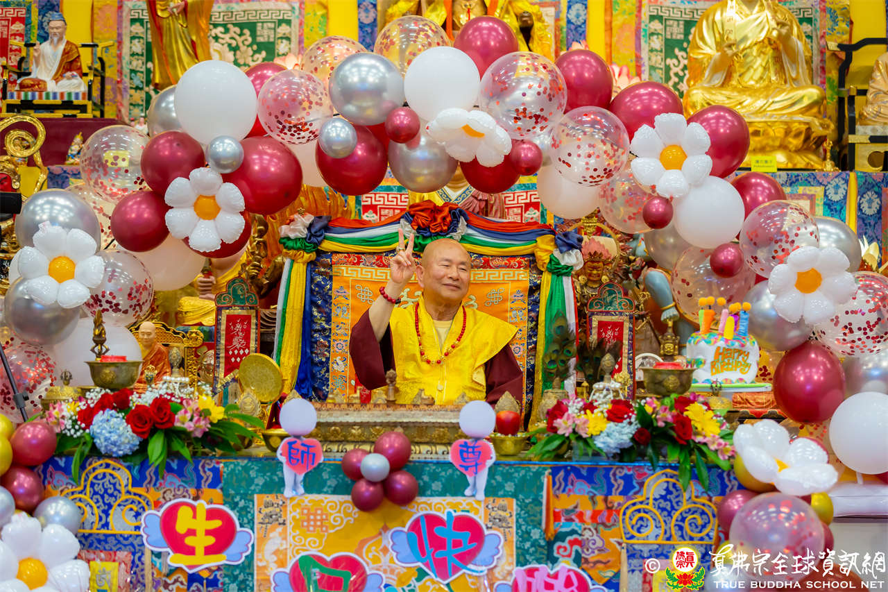 大殿外升起一個用七彩繽紛的汽球點綴而成的高聳的愛心大拱門,兩旁豎著紅白兩色的英文字HAPPY BIRTHDAY,扶手欄杆也飄揚著鮮花和汽球。大雄寶殿內鮮花錦簇、飄揚著色彩繽紛的汽球,各色各樣的供品佈滿壇城,處處洋溢著歡樂的賀壽氣氛。