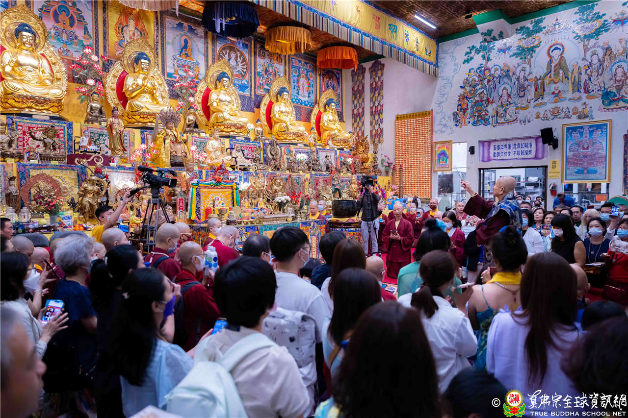 聖尊精闢的開示,令四眾弟子聽得津津有味,內心充滿法喜!聖尊給予皈依灌頂和加持後,大眾歡喜列隊,一一領受慈悲的聖尊以拂塵加持。