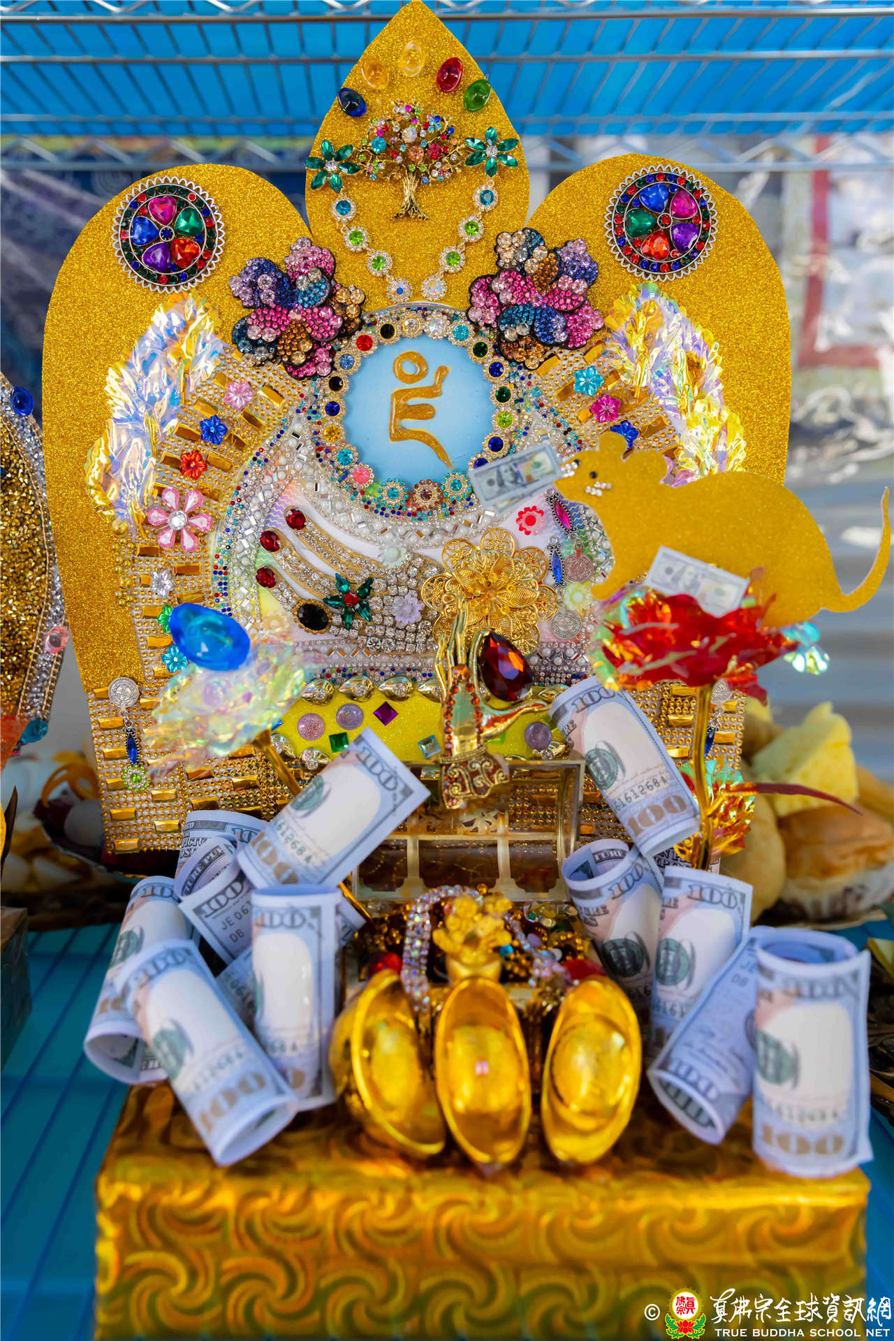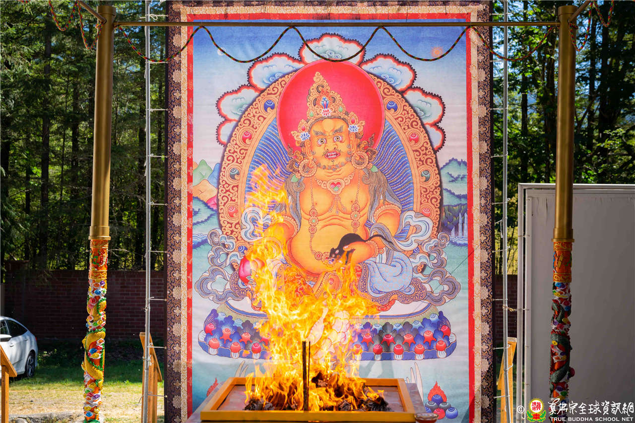 當天護摩法會主尊針巴拉黃財神是資糧主,在密教裡面屬於護世四大天王,本身是天神而且有賜福的神性,四天王就是財主。黃財神不只是在藏密非常有名,在日本的東密,也非常有名。日本四國北部香川縣琴平町有個很大的道場 -- 金刀毗羅宮,就有供奉四大天王的北方多聞天王黃財神。