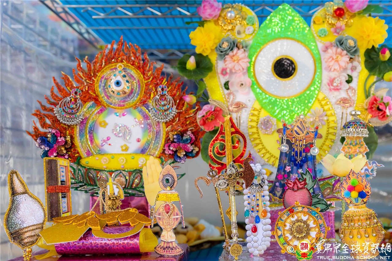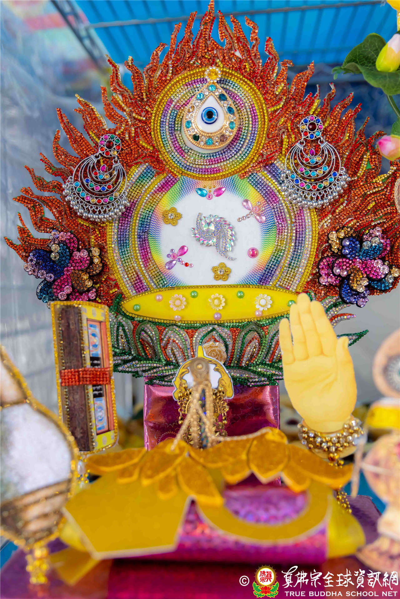 準提佛母有三眼及十八臂,是修第三眼最主要的一尊,中間兩手結的是準提菩薩的根本印。密教裡每次開始結手印的時候,都要結準提佛母手印,也是總持印。祂是法王的上師,也是普方上師的本尊。準提佛母十八手就是十八個法器,等於十八不共法。祂手上有「如意寶幢」、「蓮花」、「罐」、「索」、「輪」、「螺」、「寶瓶」、「般若篋」、「寶幔」、「金剛杵」、「鈎」、「鉞斧」、「天妙果」、「素珠」、「智慧劍」、「施無畏印」,一共有十八手。修準提佛母的法時手上沒有法器,通過觀想所修之法對應的法器放光,就可以修法。