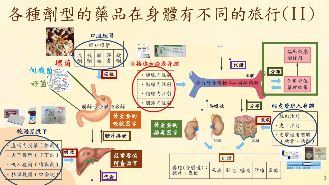 不同劑型的藥品進入身體後,其中,口服劑型的藥品,在血液中的藥品濃度會相對較低,且比較慢達到高點。每個人的不同基因、腸胃道蠕動、腸道菌叢、吃進的食物、疾病、吃的各種藥物,都會導致口服藥物進入身體後有不同的血液中濃度變化。藥品在身體裡因為直接進入靶點或產生脫靶效應,會產生複雜的臨床效應與不想要的副作用反應。(註:藥物能正確的作用於特定的目標,此特定的目標稱為靶點。脫靶效應是指藥物作用於靶點之外的地方而產生副作用。)