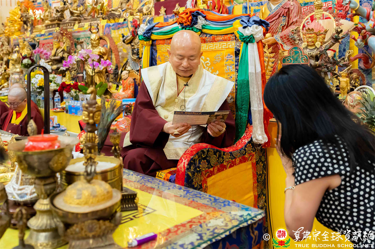 2023年9月16日,美國西雅圖雷藏寺延續著上星期秋季大法會的盛況,人潮洶湧,寺裡寺外坐滿了來自世界各國的弘法人員與善信大德,嘉賓Sun Burford女士也前來參與盛會,她熱心公益,目前擔任華大東亞圖書館之友聯席主席、Newcastle City藝術委員會董事、華州語言教師會董事,並正競選Newcastle市議員。大眾聚精會神的跟隨著聖尊蓮生活佛盧勝彥修持大白蓮花童子本尊法。