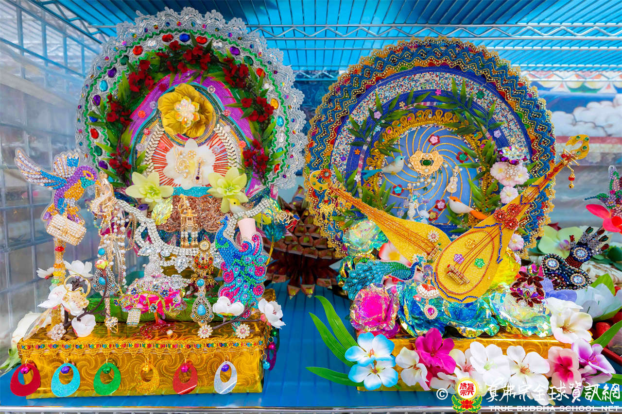 法王接下來介紹當天護摩主尊妙音天女,祂是印度教裡面最尊崇的一尊,《最勝光明經》裡提到「辯才天女品」,妙音天女也就是辯才天女。祂的名稱很多:辯才天女、妙音佛母、美音天女、妙音天女、智欲天女、才藝天女。妙音佛母有誓願,只要唸《金光明經》,祂就會來加持。妙音天女也是日本的七福神之一,是賜財的。祂的天是「大辯神用自在光潔名天」,是第九地的菩薩,地位很高。妙音天女是阿彌陀佛、文殊師利菩薩和大威德金剛的佛母。祂的聲音很美妙,辯才第一,而且是技藝天女。妙音天女法益:增加辯才、衣服、飲食、智慧,智慧、壽命、財力,令修法的人能夠圓滿,修此法的人,一切的惡心來侵害、一切災難,都可以消除。聖尊的家裡就有兩尊妙音天女佛像。