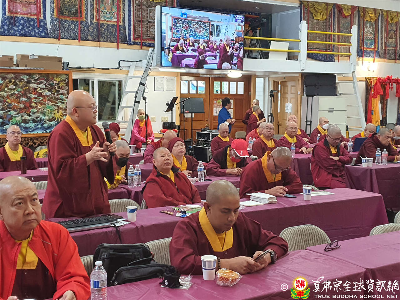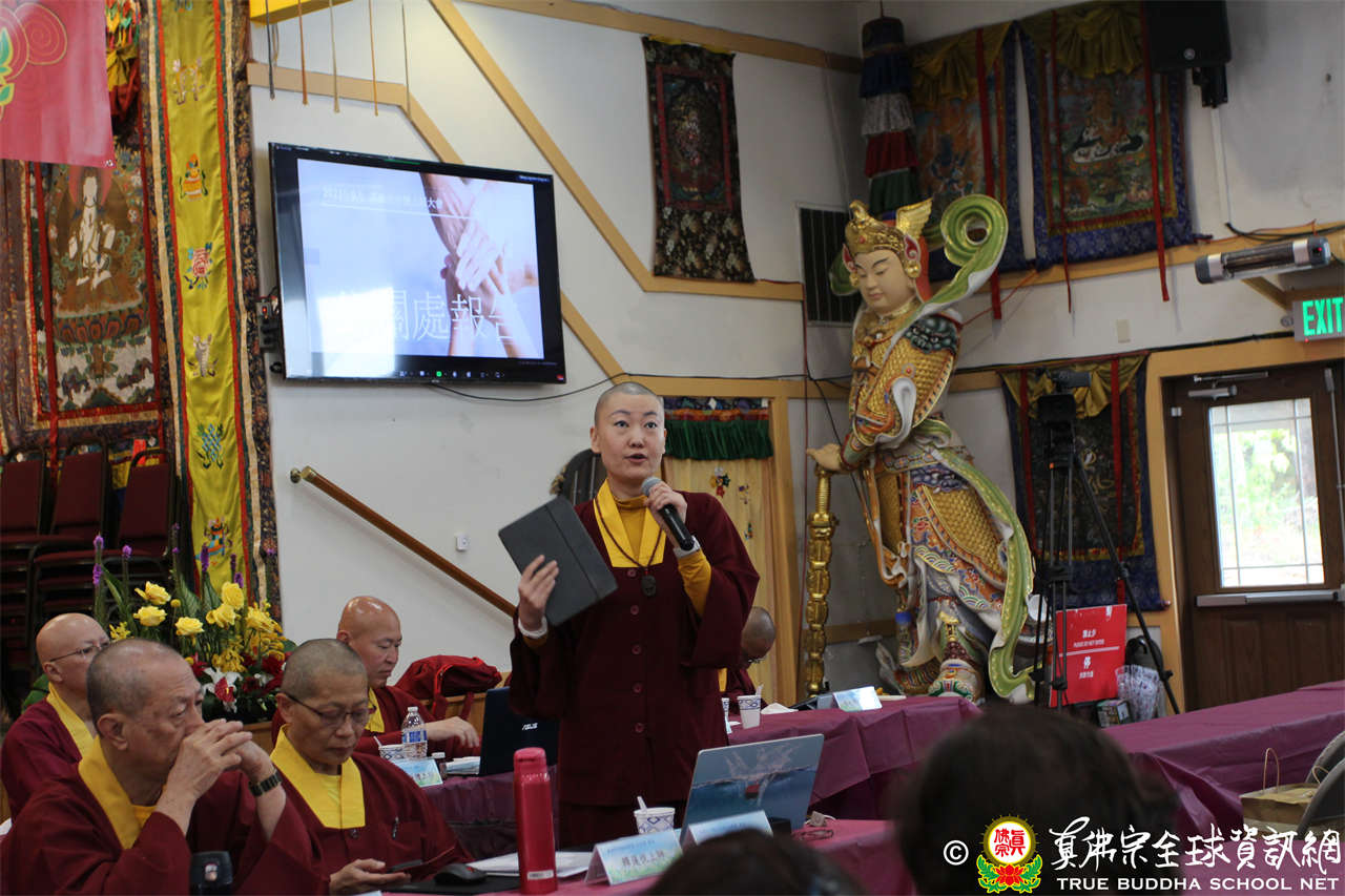 在各處報告完畢後,進行自由發言環節。最後會長程祖上師在總結時,通知上師團,監察會收到師母蓮香上師請辭監察會長之信函,由監察會蓮花常仁長老、蓮花常智長老、蓮哲長老、蓮栽長老,共同推舉蓮栽長老接任監察會長。接著會長談到宗委會以服務道場為導向,上師們共同承擔,作為宣傳推廣的橋樑,傳達各級弘法人員及道場,大家要善用真佛宗務網站,以網站為基礎,推動服務所有真佛同門,讓宗派走向專業化、系統化、組織化、合法化,走向永續發展的未來。