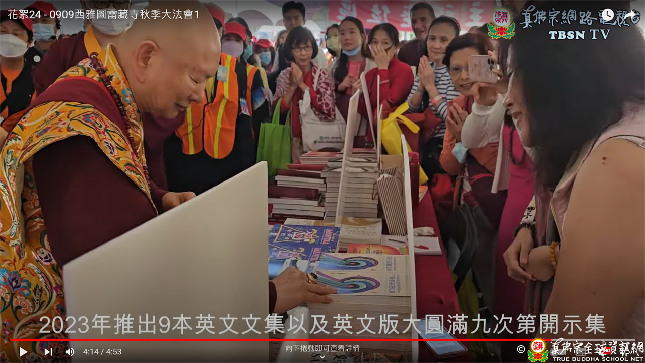師尊加持的最後一個攤位是宗委會成立的一福文化,一福文化主要出版非中文語系的師尊文集/開示集,由真佛翻譯組團隊負責翻譯,今年出版了九本英文版的文集,以及大圓滿九次第開示集,採用師尊的畫作為封面,讓英文文集的視覺享受更加的豐盛。本次大法會期間,見到有更多的英文語系的同門參加,這一本一本的英文文集對於這些弟子而言,無疑是難得的心靈雞湯,滋養著弟子們的心靈。