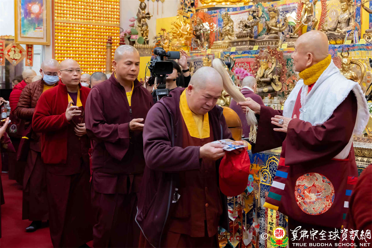 聖尊講解維摩詰經後,為新皈依者做皈依灌頂,加持大悲咒水,並以拂塵一一加持與會大眾。