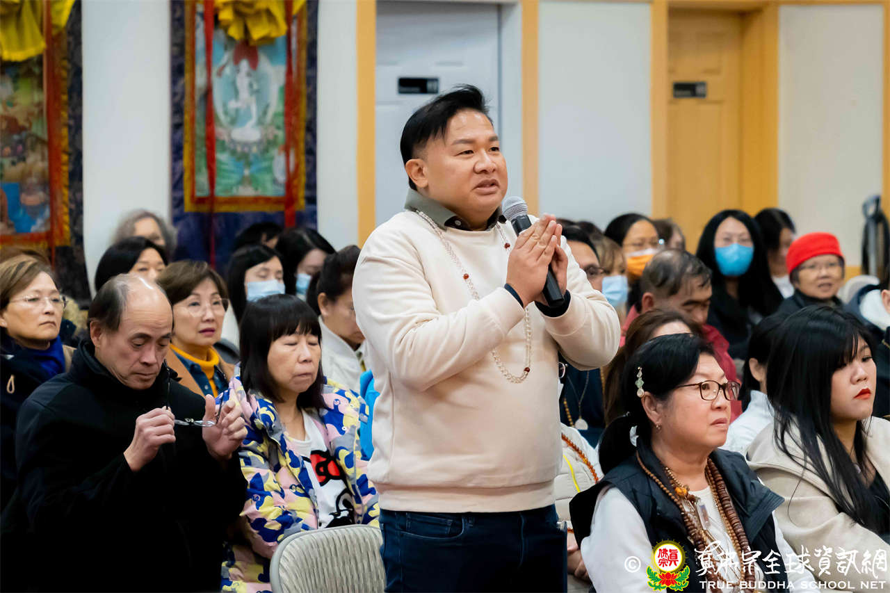 聖尊提起此次來參加法會的同們當中有一位向除蓋障菩薩發願:因為他做一筆生意每次都失敗,最後他求除蓋障菩薩讓他把障礙除掉。發了願以後他這一筆生意就做成了。聖尊請該位同門出來。這位從新加坡來的同門馬上起身,聖尊問他是怎麼跟跟除蓋障菩薩祈求,他陳述自己是9月來西雅圖參加聖觀音菩薩的法會的,當時他有一筆生意已經在進行當中,前兩次差點就成功,就差那麼一點點,他覺得很奇怪,為甚麼稍微有一點點的障礙?在上網時看到11月有除蓋障菩薩法會,除蓋障菩薩是真佛經裡八大菩薩之一、也是高王經裡八大菩薩之一,他一直非常的觸動。於是當時就向除蓋障菩薩許願:「如果讓我這個交易在這段時間之內,這次能成功的話,我就會立刻買機票過來做主祈。」果然在一個星期之內這筆交易就成功了。(眾人鼓掌)