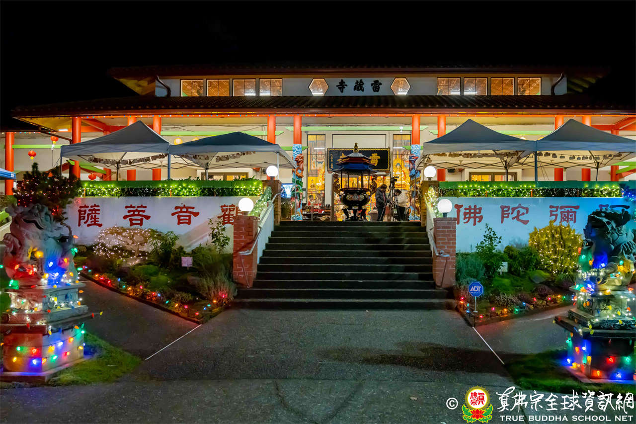 2023年12月2日晚上八時,美國西雅圖雷藏寺舉行觀世音菩薩本尊法同修,恭請根本上師蓮生活佛盧勝彥主持。雷藏寺為了迎接即將到來的聖誕節,精心裝飾,好一片絢麗的光之秀。每一盞燈飾都宛如璀璨的寶石,懸掛在樹枝間,閃耀著柔和的光芒,整座寺廟呈現著歡樂氛圍。