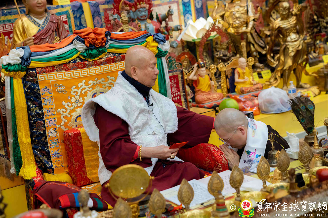 聖尊精彩寶貴的法語開示後,慈悲為新皈依弟子做皈依灌頂,並加持大悲咒水、開光佛像,及持拂塵加持與會眾等。