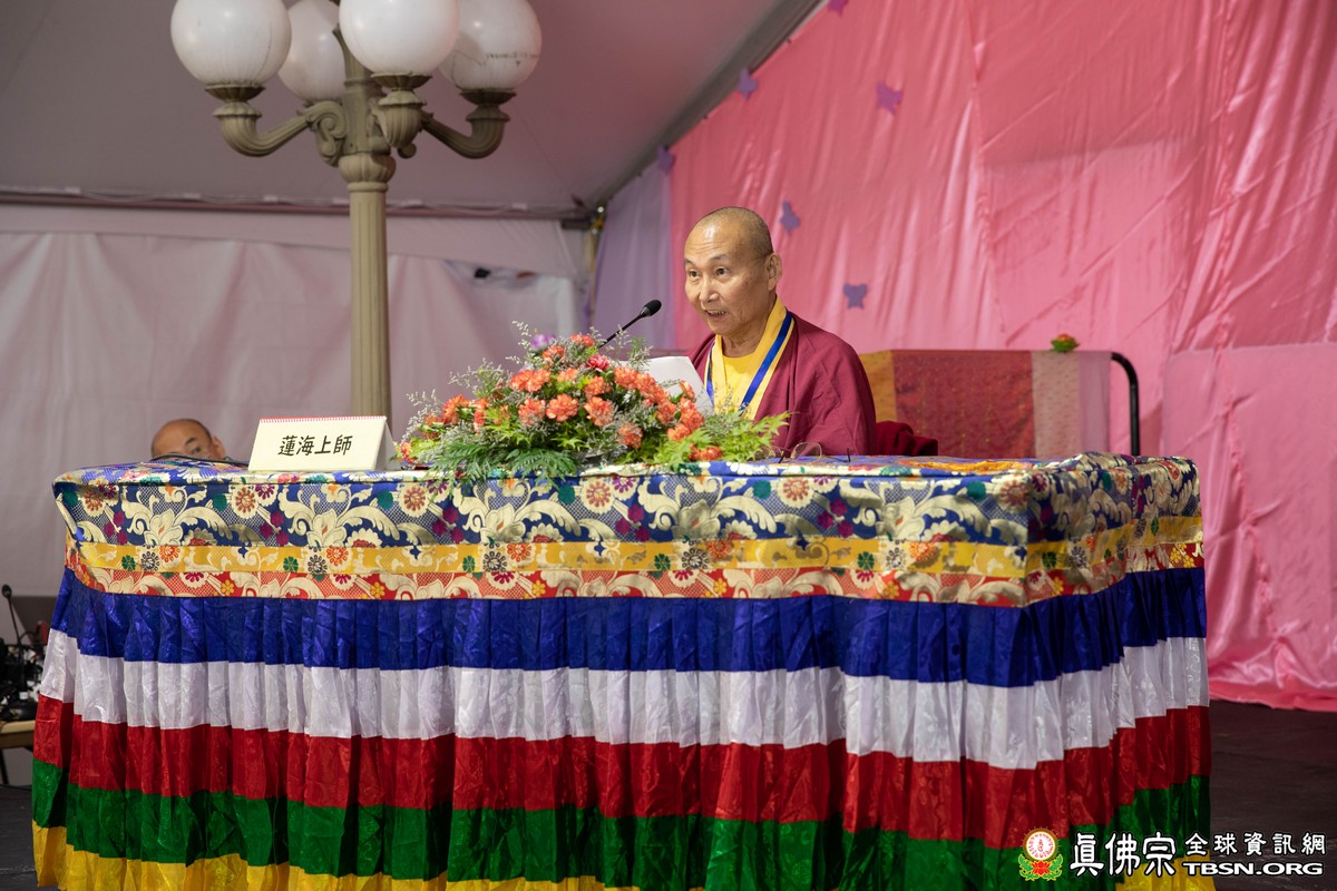 午餐後,由蓮海上師接棒,再次開啟講座,為與會眾弘法人員與大眾開示。蓮海上師講述「六方禮經」,一切戒律自五戒始,不僅是外在行為,心也要守。並一一簡釋五戒的意義。