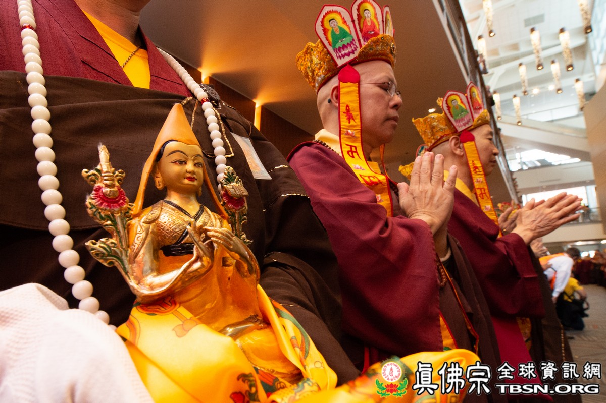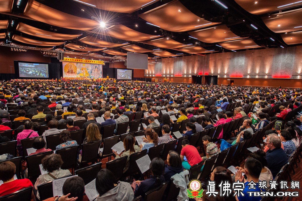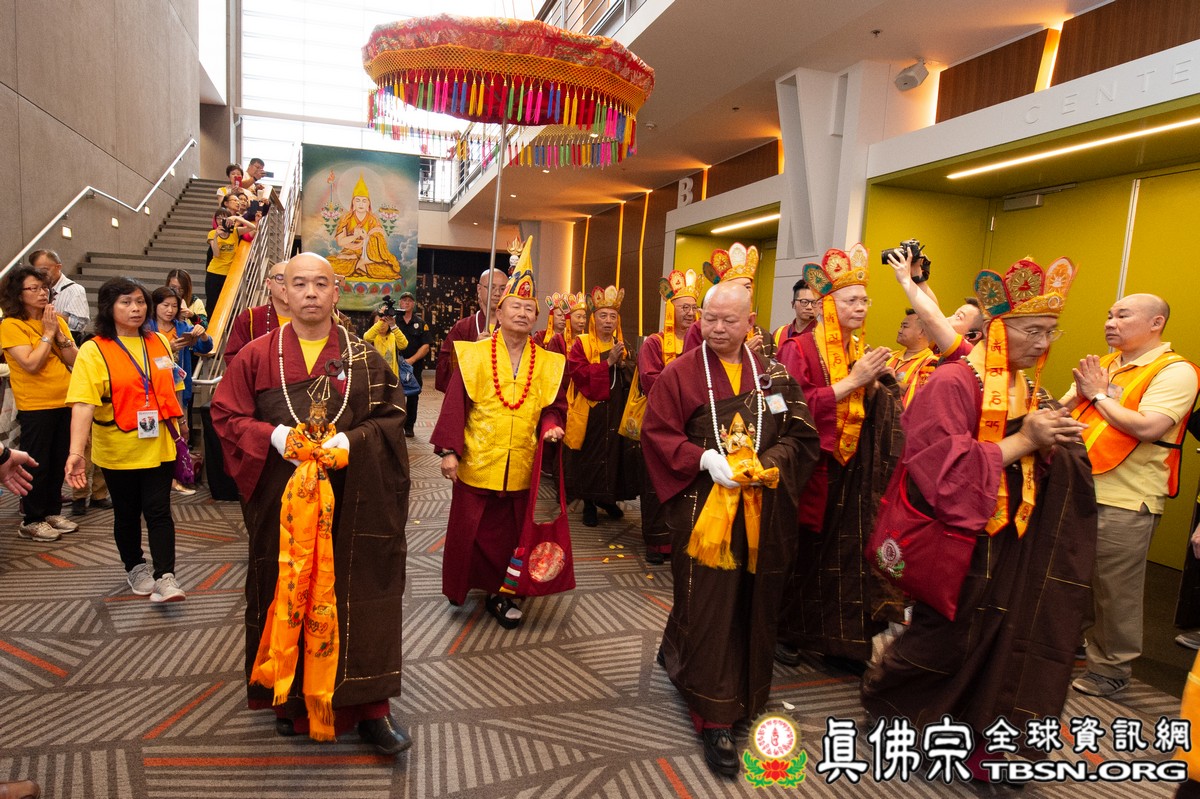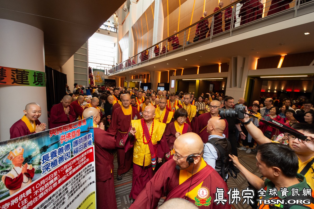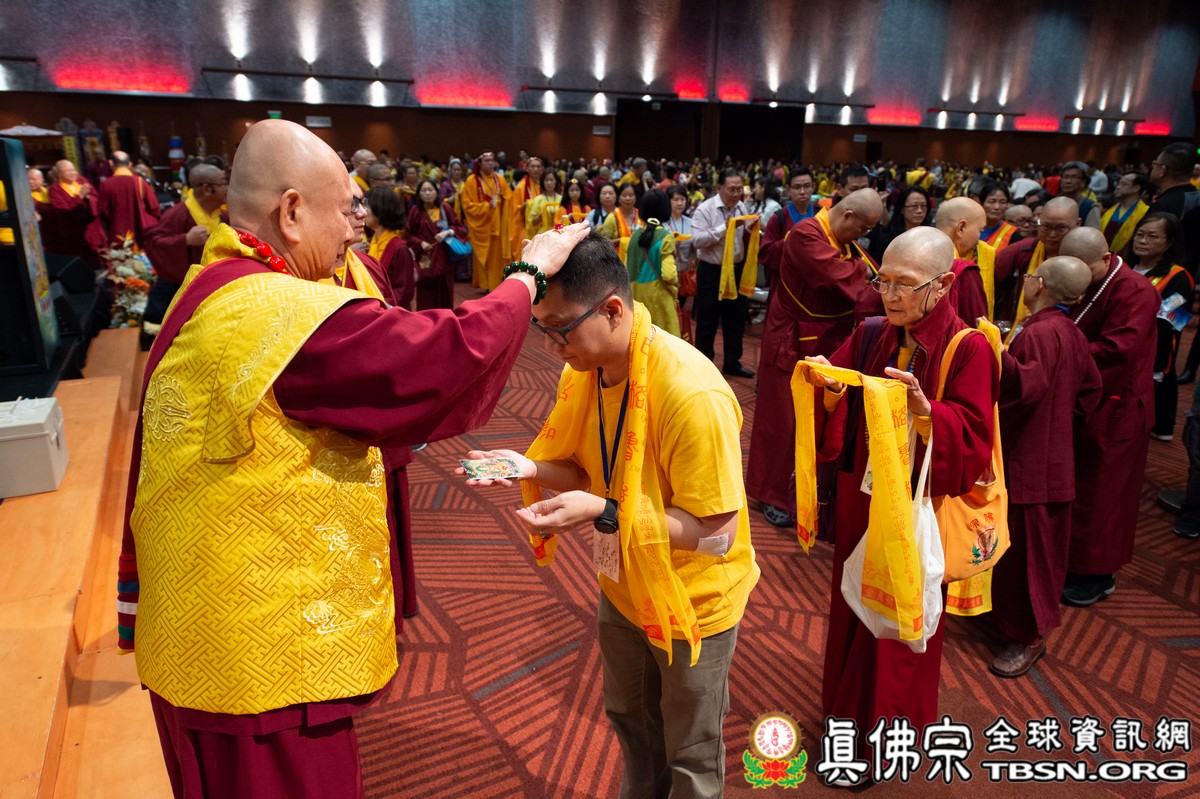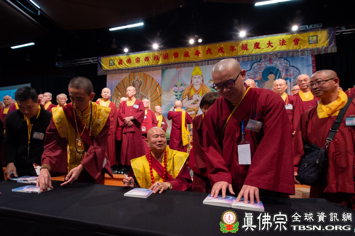 法會當日早上十點半,所有主祈者排著長長的人龍環繞會場,等候敬獻哈達,顯示出真佛弟子敬師重法的誠心。之後,聖尊立即開始為大眾簽書,此時會場播放著宗喀巴祖師與阿彌陀佛的莊嚴咒音。