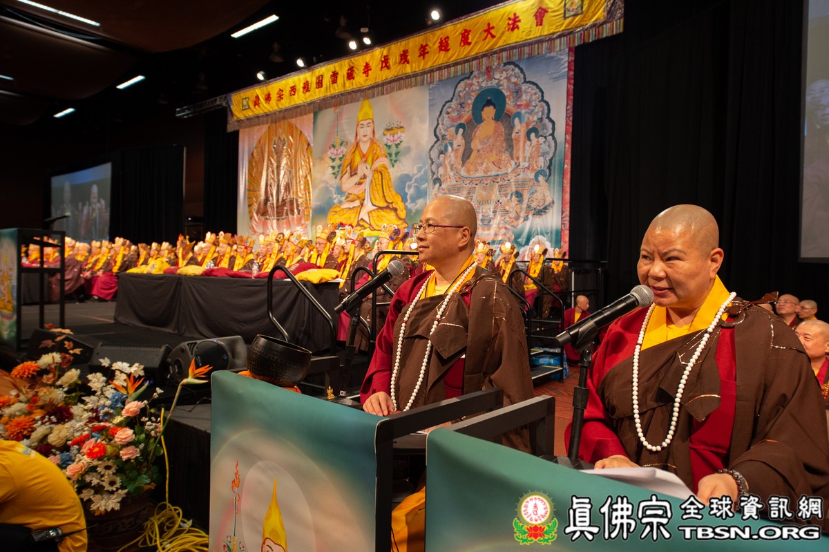 法會於下午兩點整開始,由迎師隊伍手持法器、佛幡,灑花迎佛,迎請聖尊蓮生活佛開壇授法。爐香乍爇,秋季大法會正式揭開序幕。首先,是由盧勝彥佈施基金會總裁盧佛青博士談到;基金會已經成立至今已經十年了,捐出超過兩百萬美元用於健康照顧和教育計畫上。盧佛青博士也向大家報告2018年受贈的單位及獲得蓮花獎學金者,各單位也紛紛致上感謝祝賀基金會成立十周年。在慶祝十周年慶的同時,她特別向創辦人蓮生活佛致上最高的敬意,基金會也特別製做了紀念筆要送給大家,此筆象徵聖尊的恆心與毅力的寫作精神。