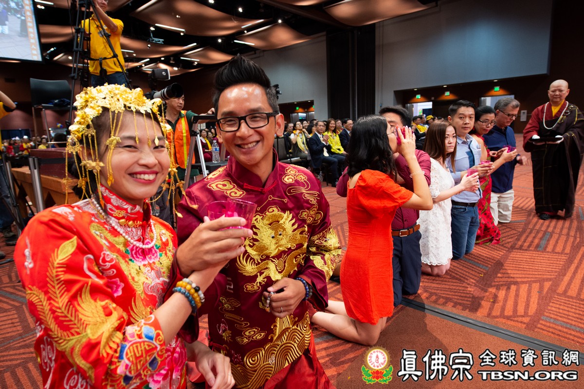 聖尊還為四對新人做福證儀式,在與會大眾親證下,新人飲淨水、交換信物。師尊祝福新人家庭圓融,非常的圓滿一直到老。