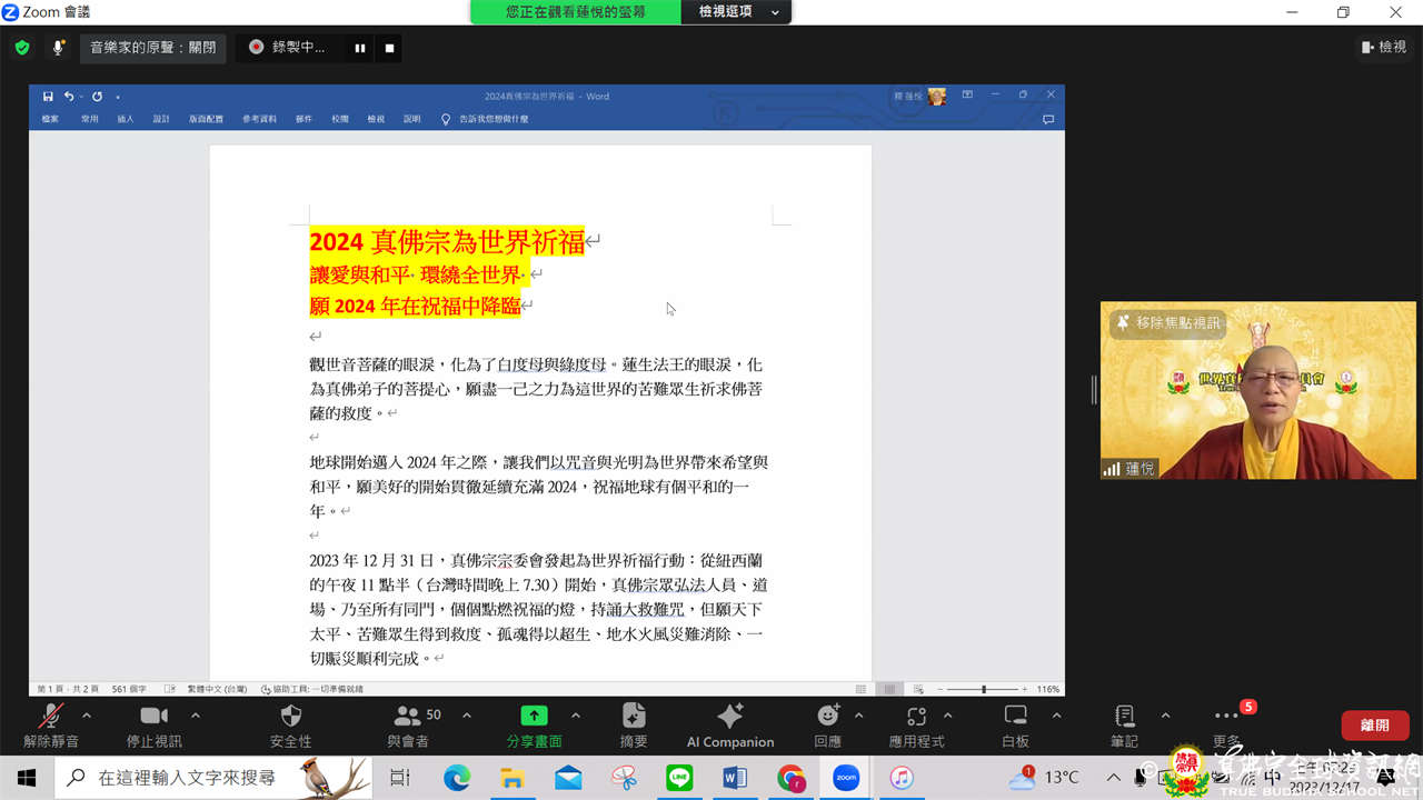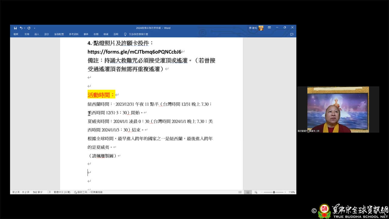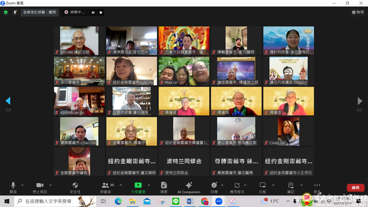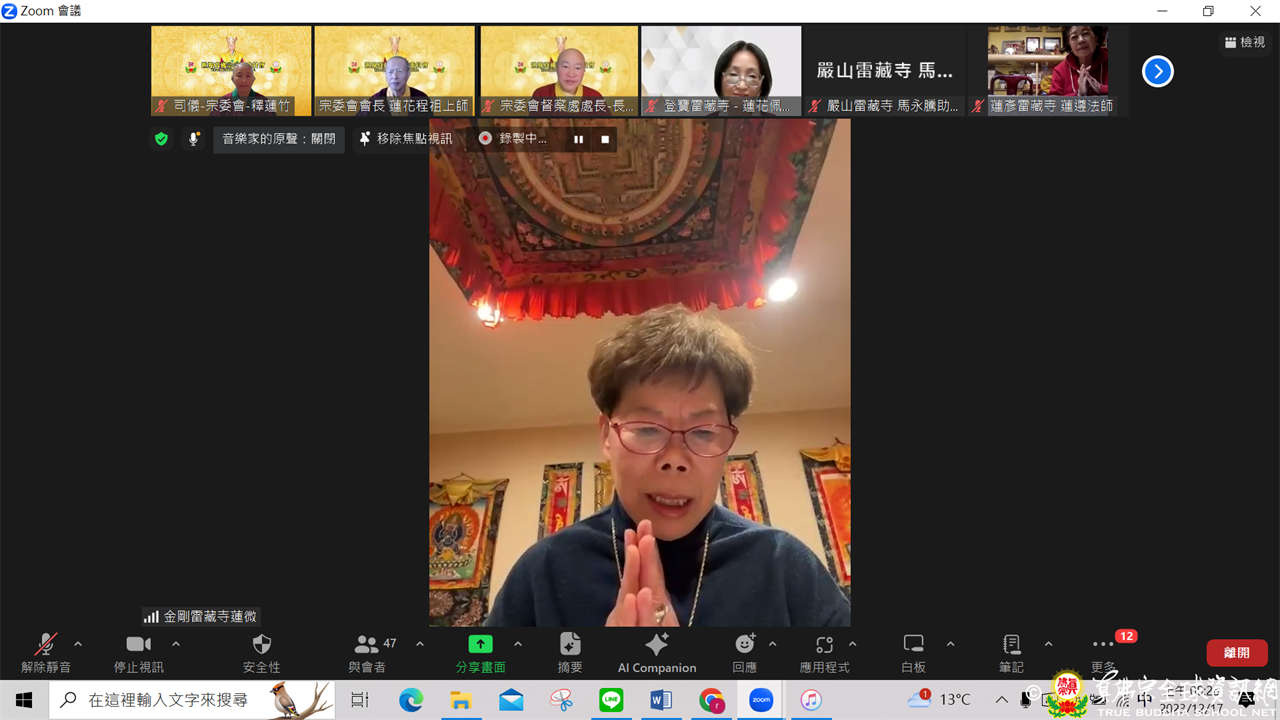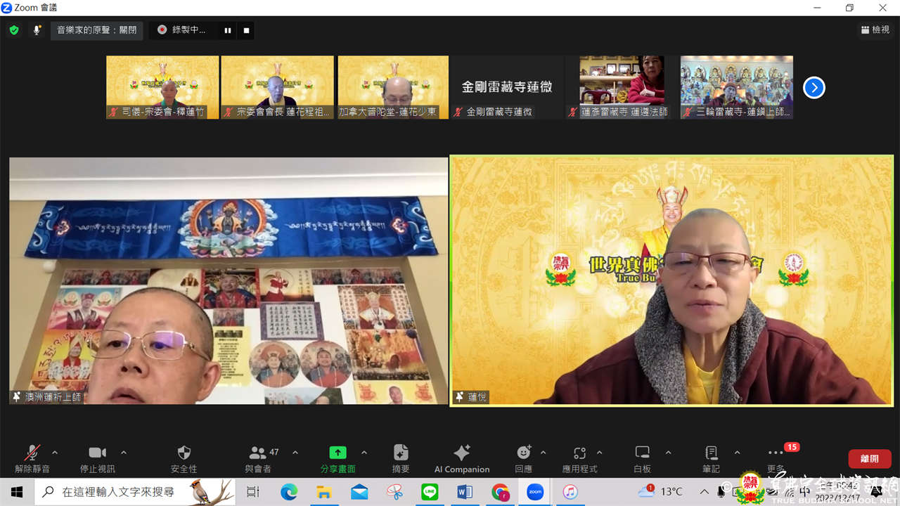 世界真佛宗宗務委員會核心小組與美國、加拿大及大洋洲真佛宗宗委會代辦處共有51位成員,於西雅圖時間2023年12月16日,於ZOOM線上召開首次交流會。本次交流會,主要由督察處處長長老釋蓮僧上師說明宗委會代辦處的功能及責任,以及與各地代辦處互動交流,氣氛溫馨討論熱烈。