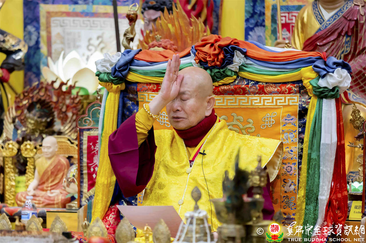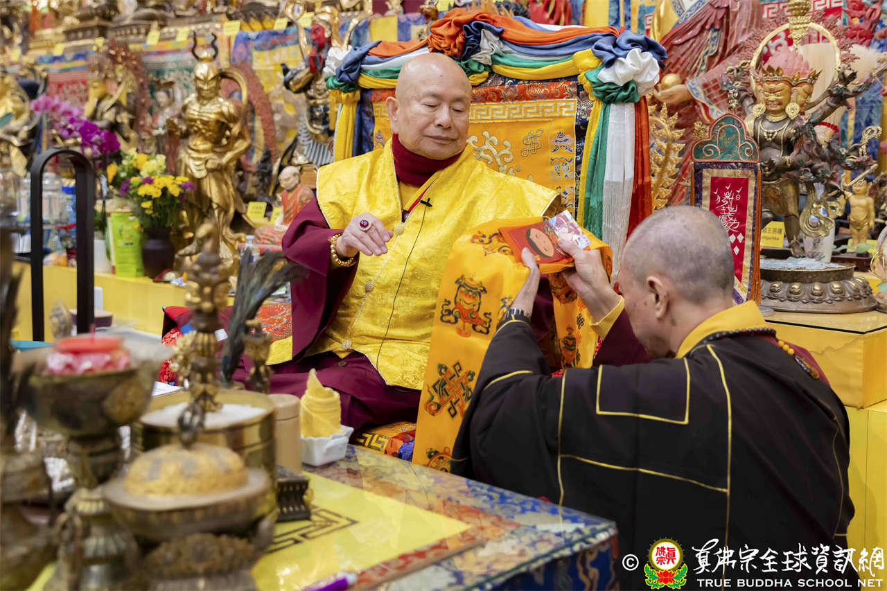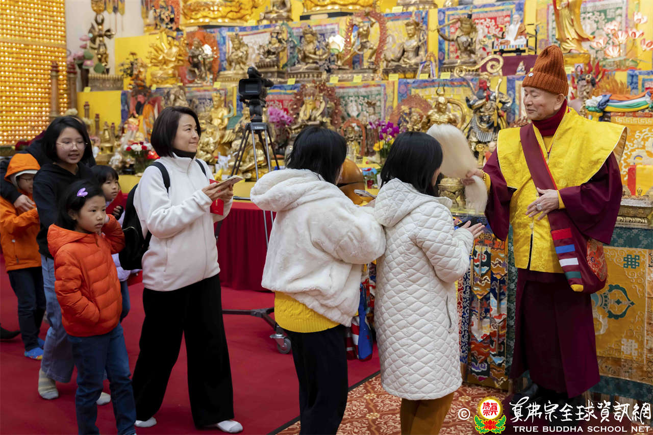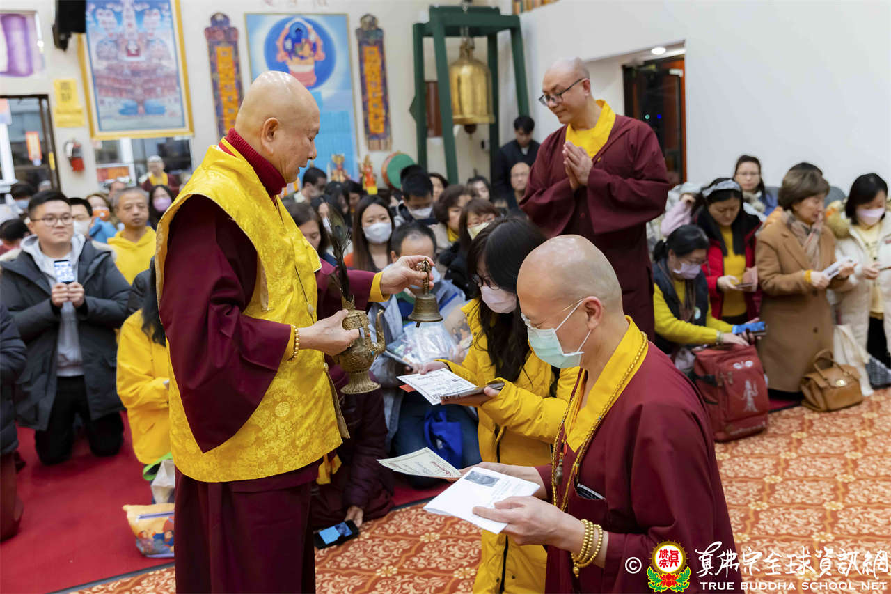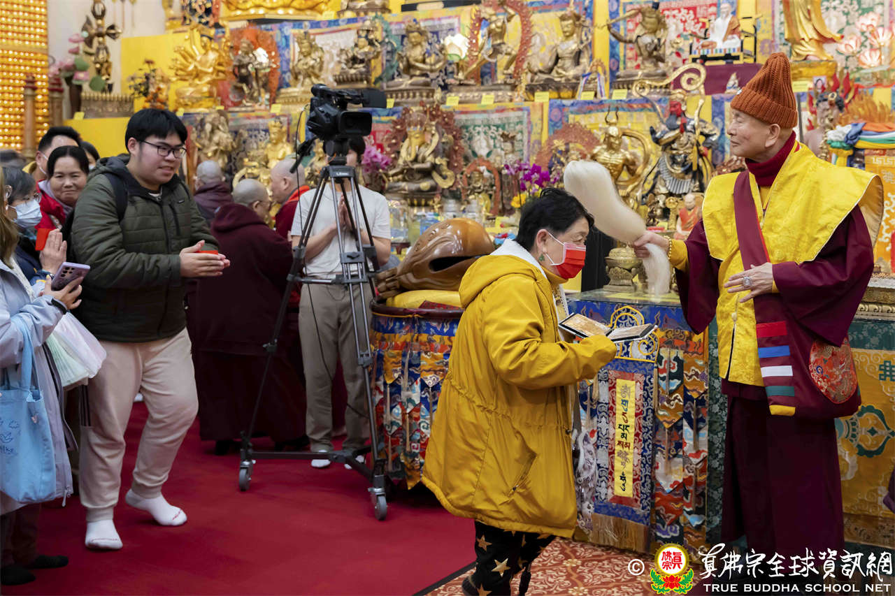 聖尊精妙的開示結束後,慈悲為求皈依者授予皈依灌頂,並加持與會大眾、加持大悲咒水及開光佛像,再以拂塵一一為弟子們摩頂加持。