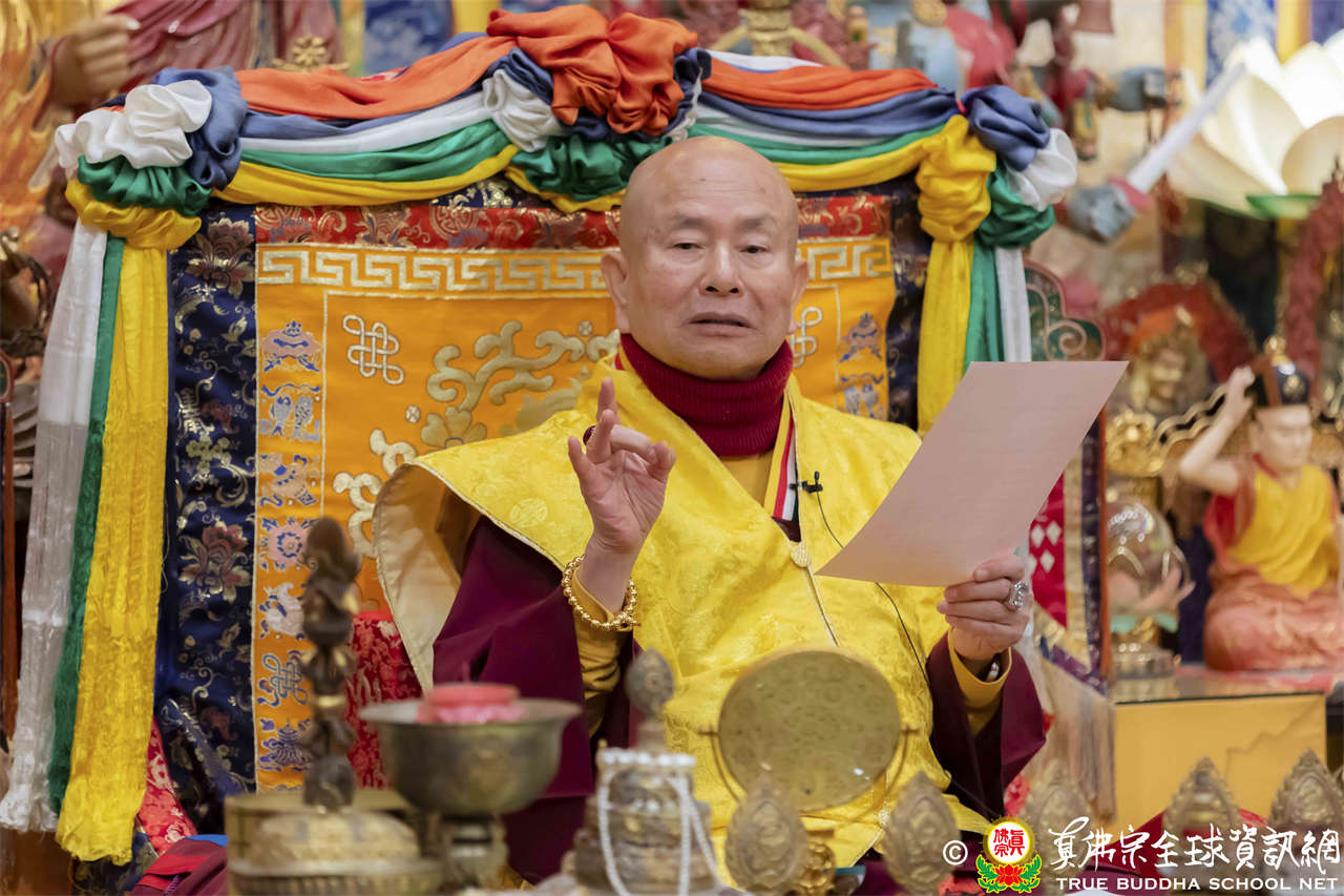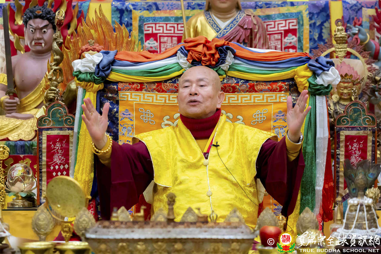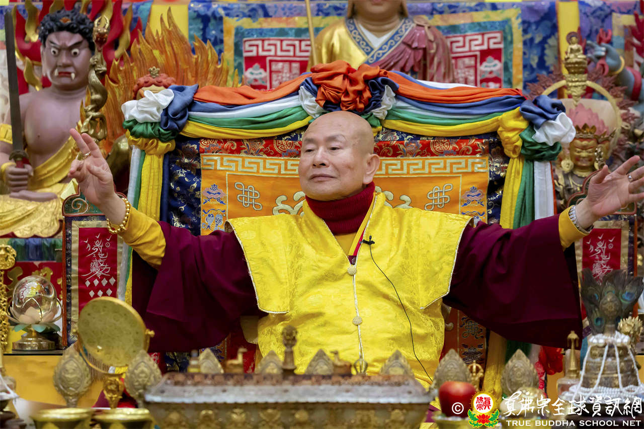 在眾人的引頸期盼下,聖尊親臨大雄寶殿帶領四眾弟子同修黃財神本尊法。在肅穆莊嚴的同修儀式結束後,聖尊首先很愉悅的祝福大家聖誕快樂及元旦新禧,接著就談到今晚的同修主尊針巴拉——四天王當中的多聞天王,並說在天上四天王是最有錢的富豪,祈禱四天王,祂們不只可以守護修行人、護持佛教,甚至可以守護國家,祂們有這種神聖的力量。