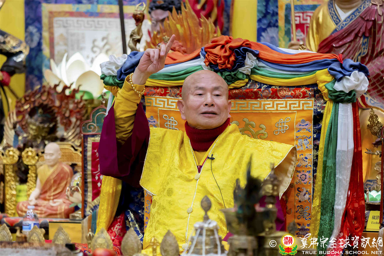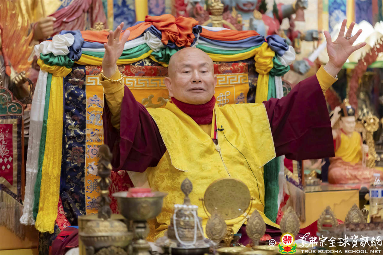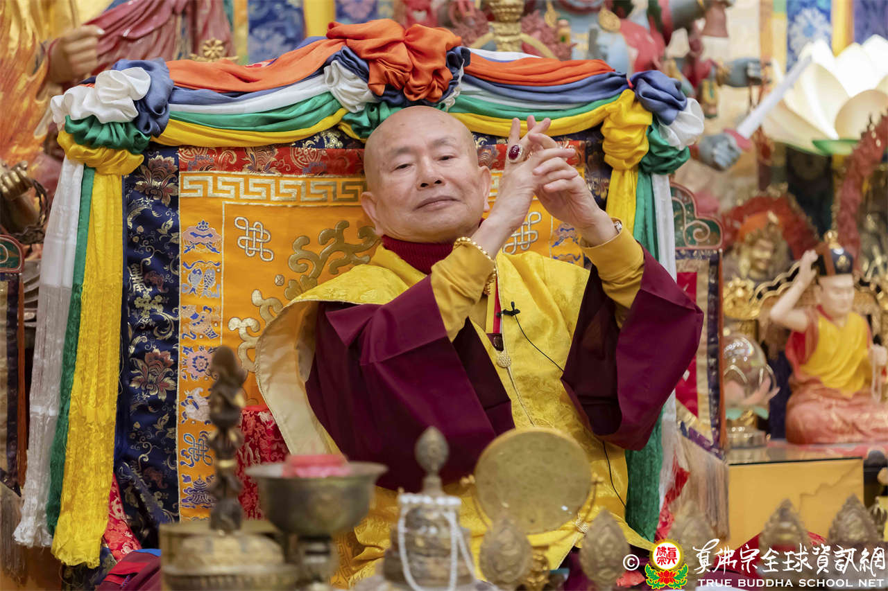 在眾人的引頸期盼下,聖尊親臨大雄寶殿帶領四眾弟子同修黃財神本尊法。在肅穆莊嚴的同修儀式結束後,聖尊首先很愉悅的祝福大家聖誕快樂及元旦新禧,接著就談到今晚的同修主尊針巴拉——四天王當中的多聞天王,並說在天上四天王是最有錢的富豪,祈禱四天王,祂們不只可以守護修行人、護持佛教,甚至可以守護國家,祂們有這種神聖的力量。