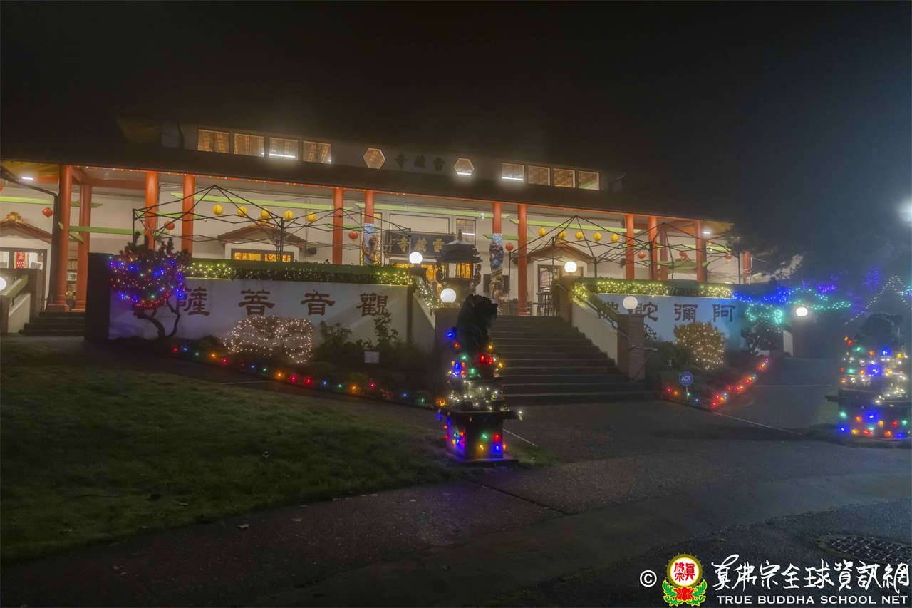 最後,眾弟子簇擁著與聖尊一起步出廟門,夜裡七彩的聖誕燈更顯得璀璨,能師徒共聚一起歡度聖誕佳節,人生如此,夫復何求。西雅圖雷藏寺謹此祝福大家聖誕快樂、元旦吉祥!