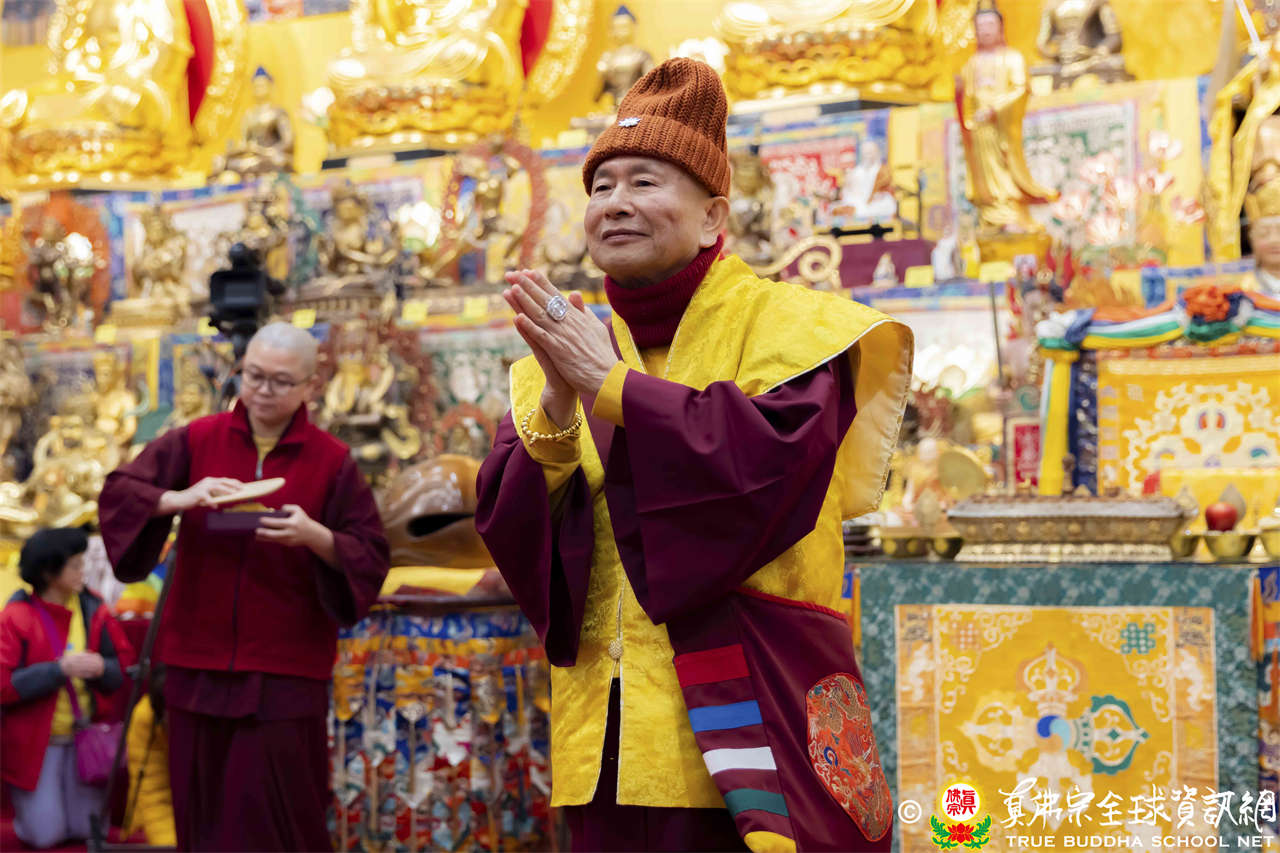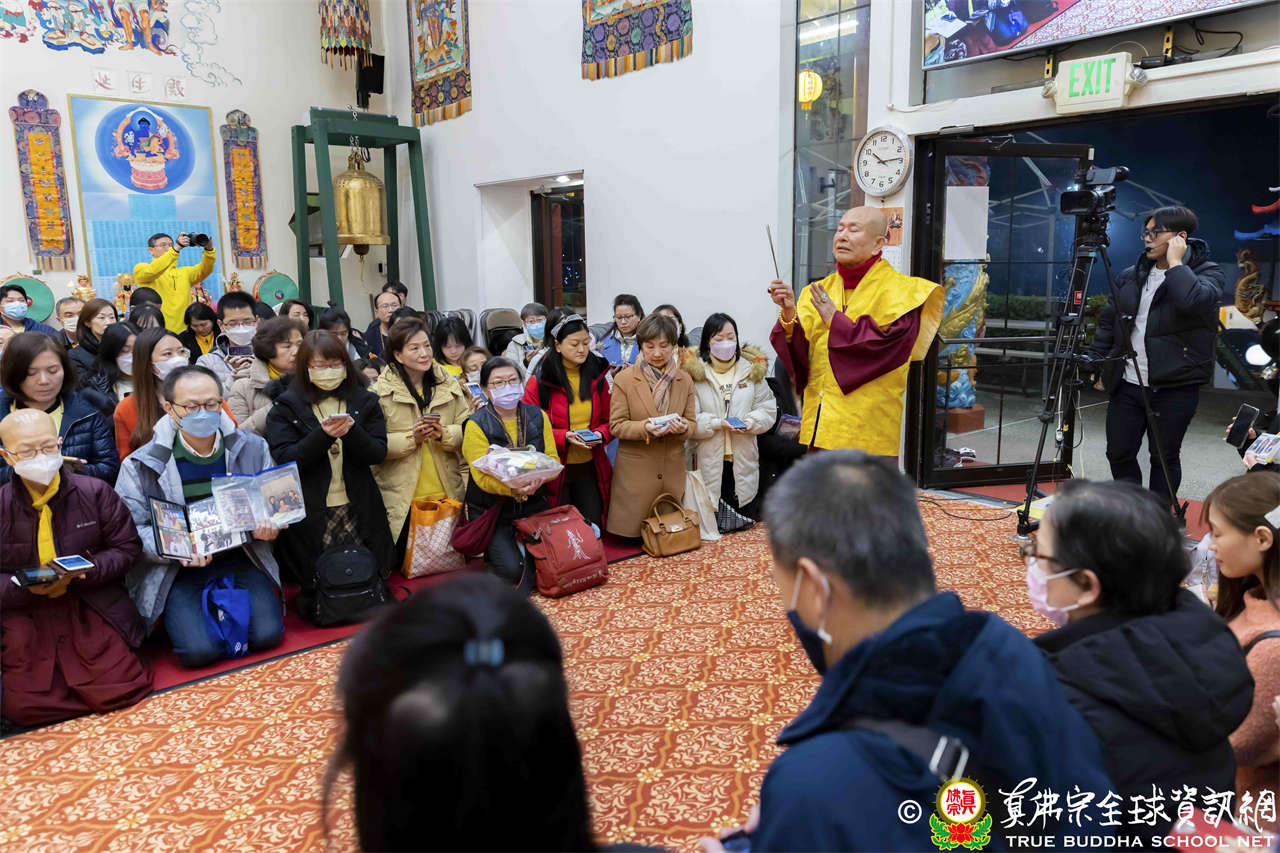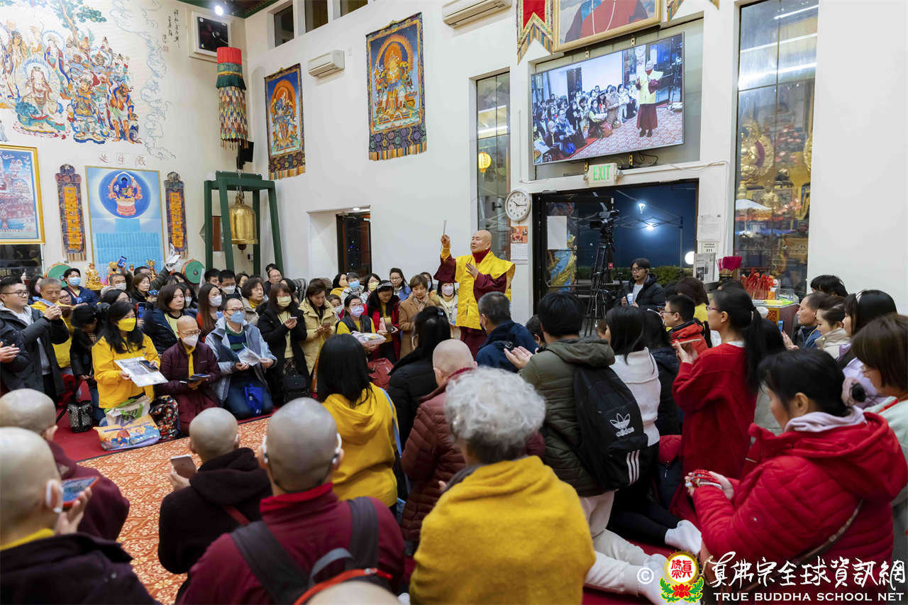 美國聖誕節平安夜的前夕,祖廟裝飾了許多色彩繽紛的聖誕燈,廟前兩側的真佛密苑、宗委會辦事處、雷藏寺圖書館……等處,也都布置了熱鬧的七彩燈飾,處處充盈著濃濃的聖誕氣息。今晚祖廟的大雄寶殿燈火通明,大家見面都彼此祝賀聖誕快樂,有許多遠地而來的同門是特別趕來西雅圖與聖尊、師母一同歡度聖誕佳節。