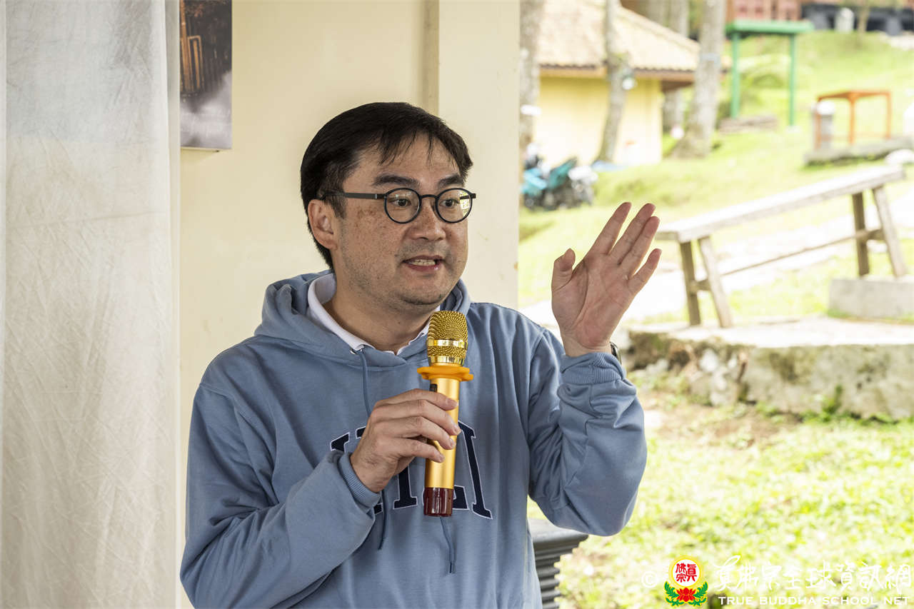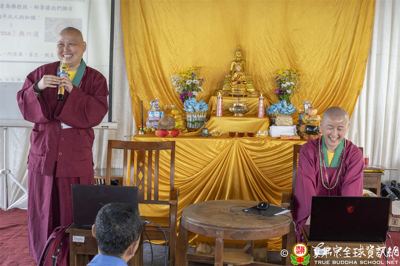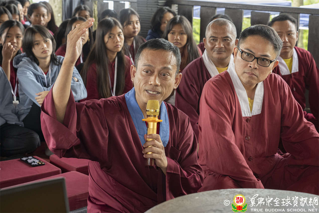 首先教授師以簡單的小活動,頓時讓在場的真青們點燃熱情。佛法分享內容主要是讓青年們明白何謂因果、何謂六道輪迴、何謂慈悲喜捨,佛教徒是依著慈悲來對待所有的人事物,教授師以其自身與真青同齡時的經驗分享,博得在場大眾哈哈大笑。