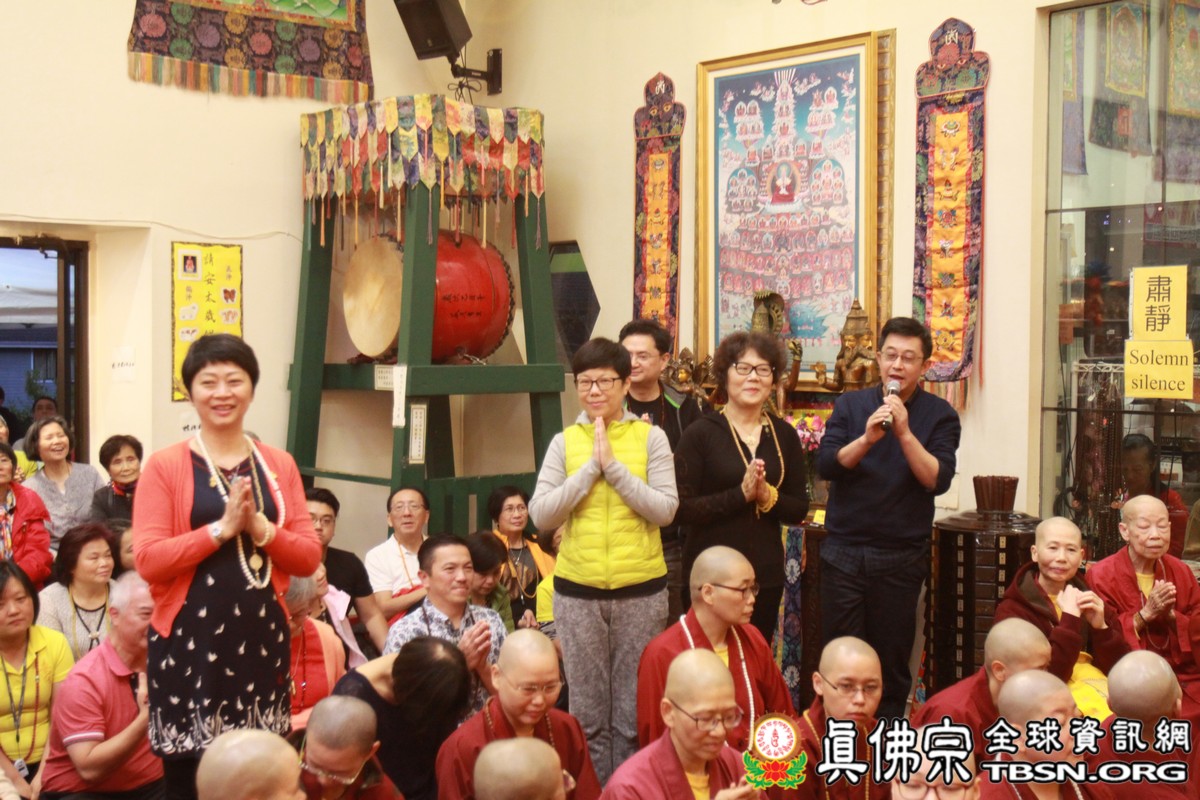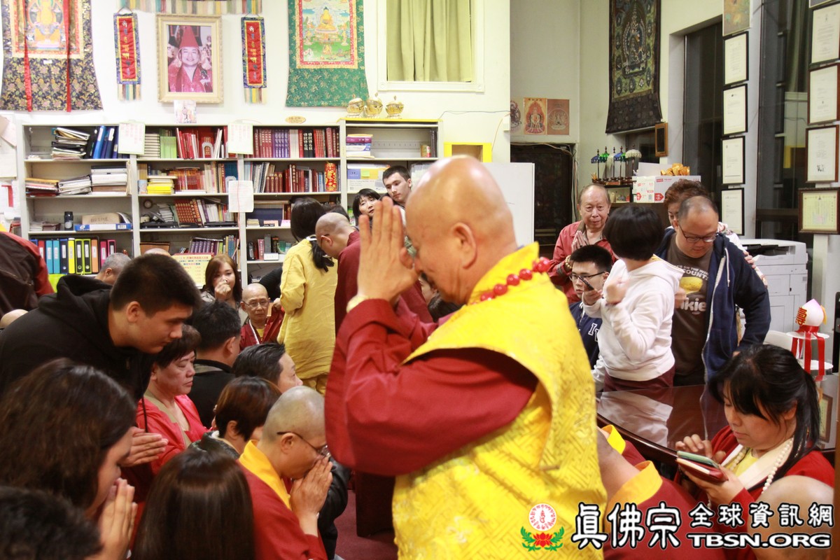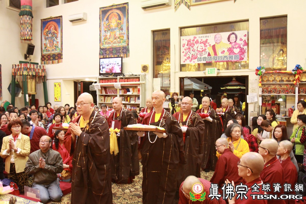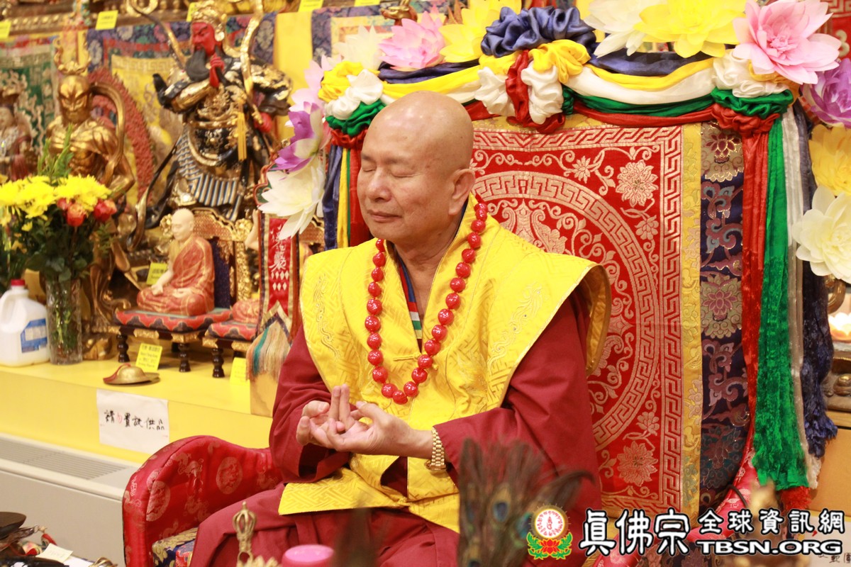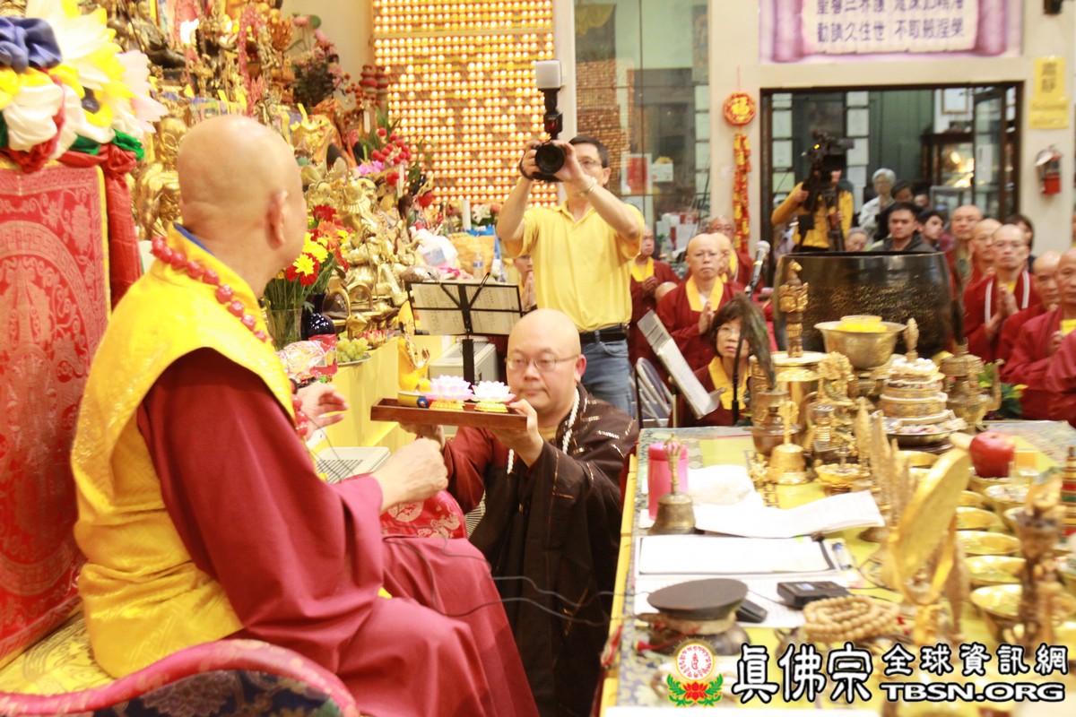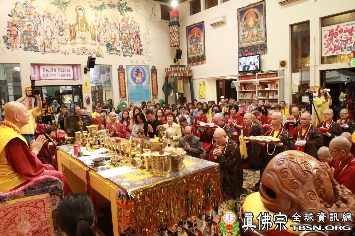 今晚的同修本尊是「黃財神」,同修會修法結束後,西雅圖雷藏寺舉行了隆重莊嚴的宗喀巴祖師唸誦法請法儀式,全體弟子虔誠祈請師尊蓮生活佛轉大法輪,首傳「宗喀巴祖師念誦法」。