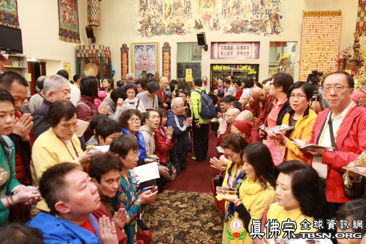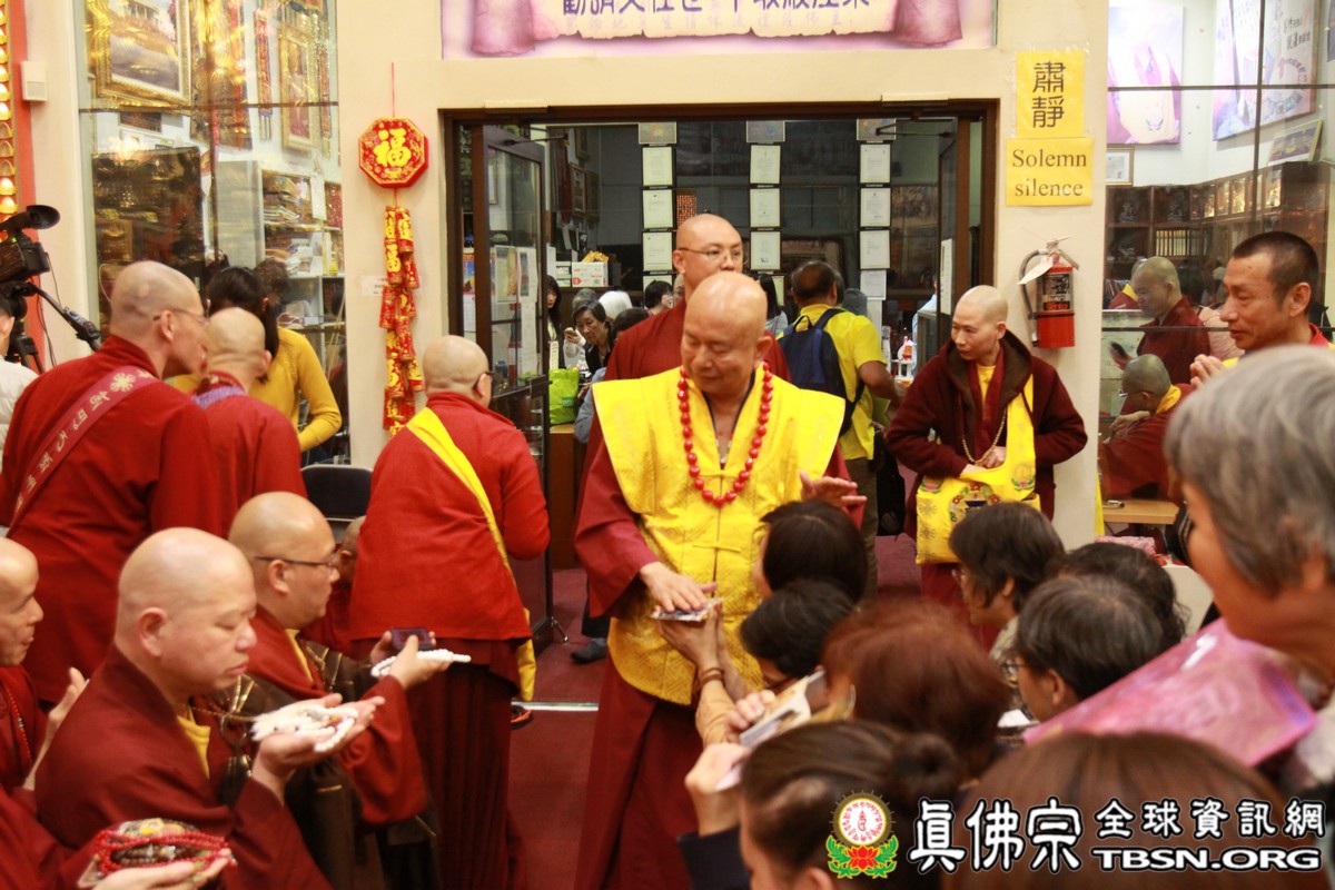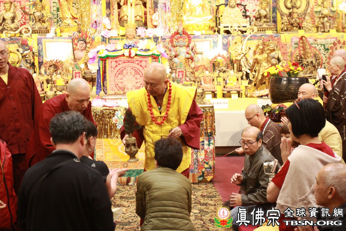 精彩圓滿的開示結束後,聖尊與大眾一起唱誦佛號,並為求皈依的信眾賜受灌頂、加持大悲咒水,以及開光佛像,臨行前還為大眾摩頂加持。求摩頂加持的信眾,人潮排到寺外的圓環,可以完全感受到真佛弟子們踴躍護持根本上師及虔誠重法的心。感恩根本上師再次傳授無上殊勝大法,利益無數眾生。