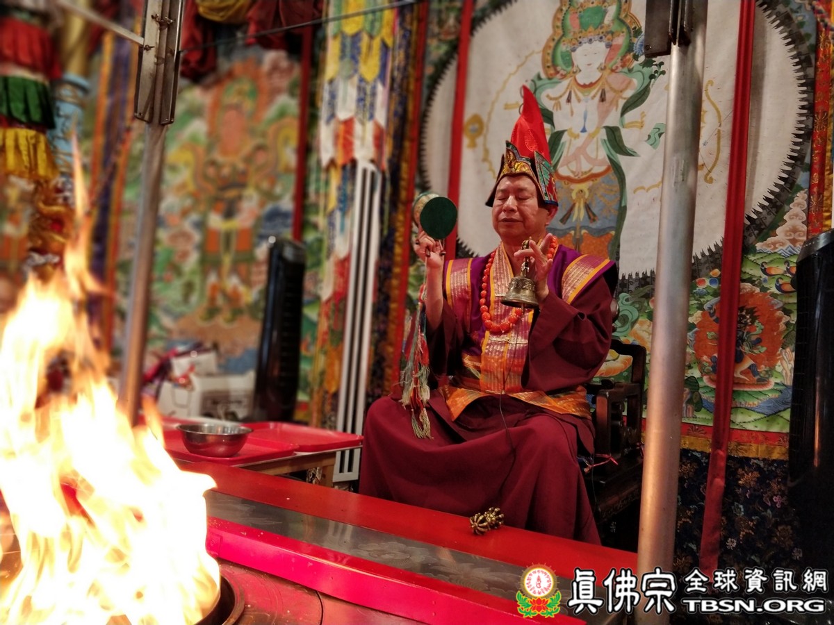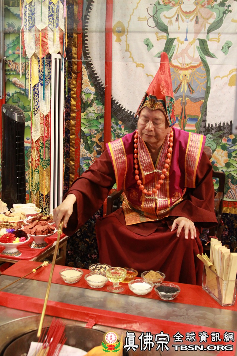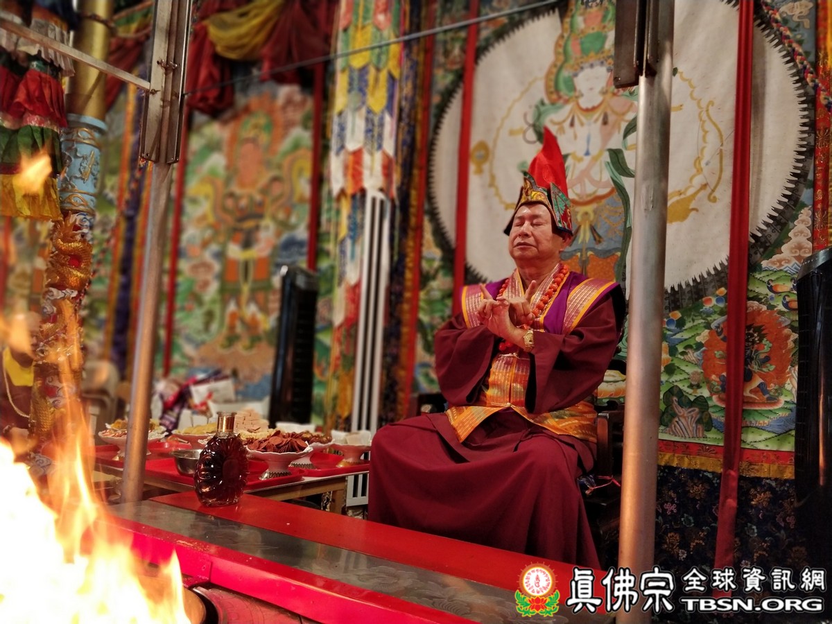 接著下午三時,真佛宗根本傳承上師無上法王蓮生活佛,主持「蓮華生大士護摩大法會」,並講授《道果》。