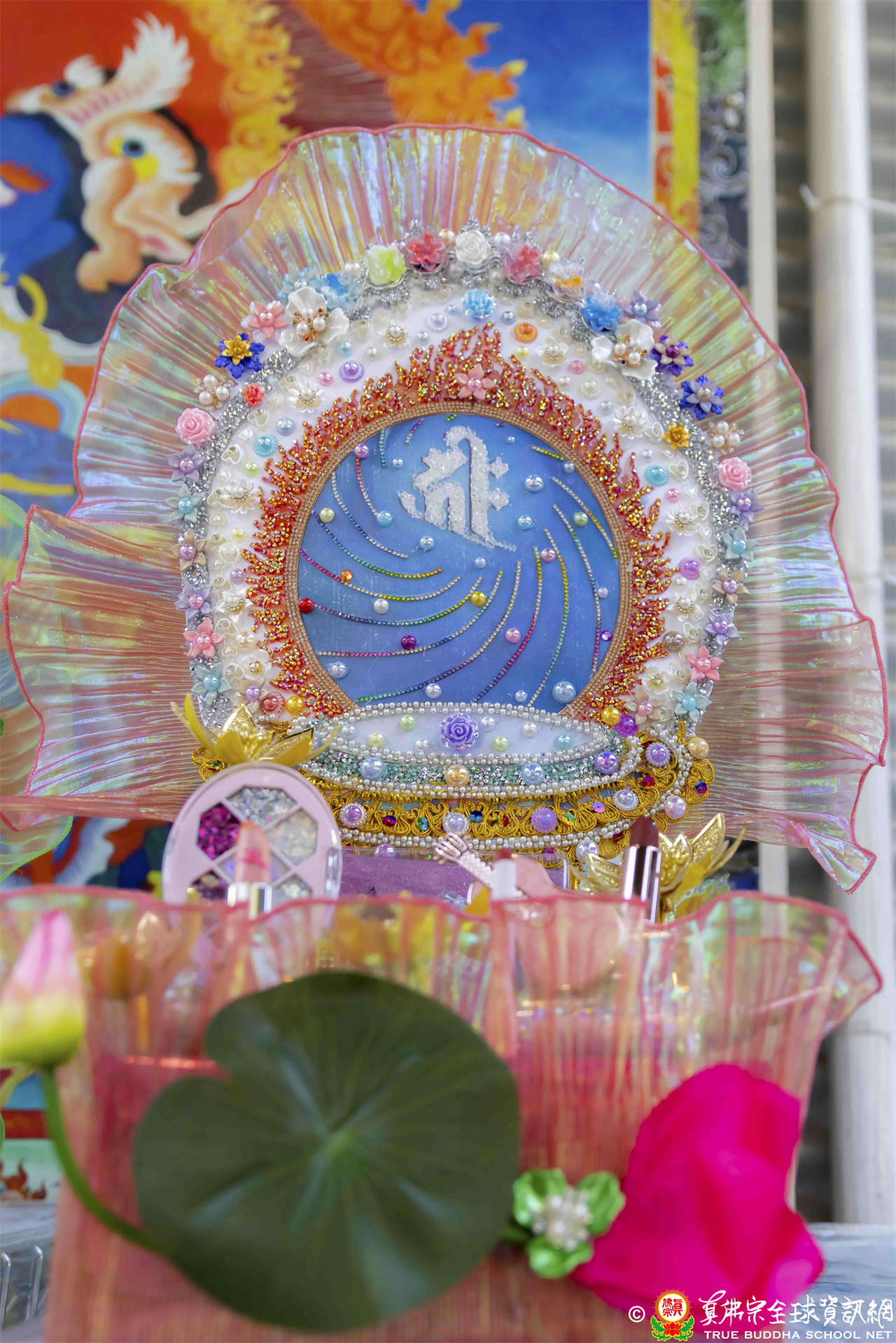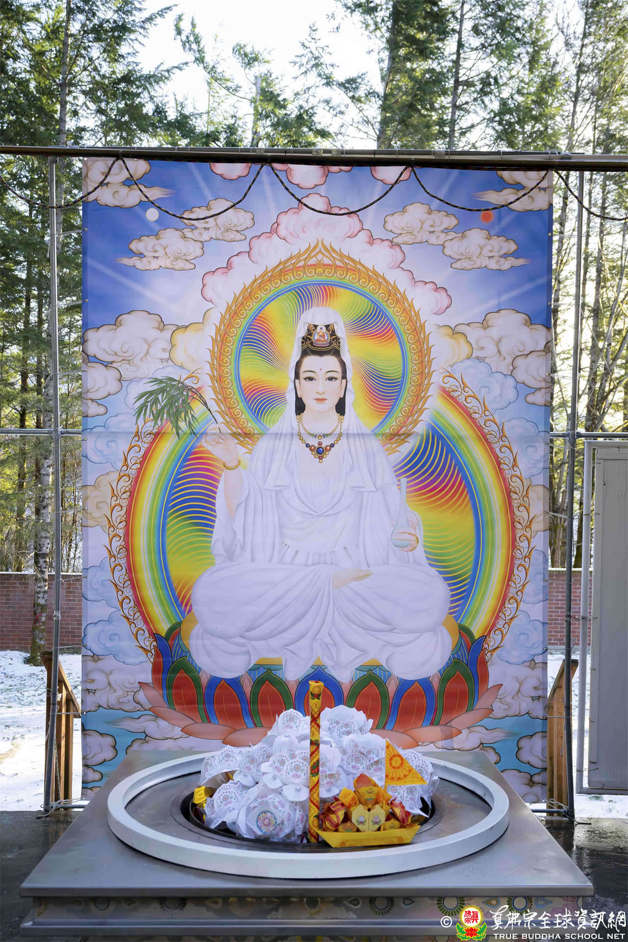 接著法王介紹法會主尊觀世音菩薩。法王說,只要是佛教徒,都知道觀音彌陀。中國的比丘見面就稱唸「阿彌陀佛」;比丘尼見面則稱唸「觀世音菩薩」。觀世音菩薩,廣大靈感、千百億化身、千處祈求千處現,苦海常作渡人舟。觀世音菩薩楊枝净水,一灑就是清淨;二灑自性清淨;三灑一切自性清淨,也就是所有衆生全部清淨。觀世音菩薩有很大的力量,祂也是如來,因爲慈悲衆生,才顯現觀世音菩薩,所以不可以忽視,尤其是奉觀世音菩薩為主尊的行者,更不能忽視。