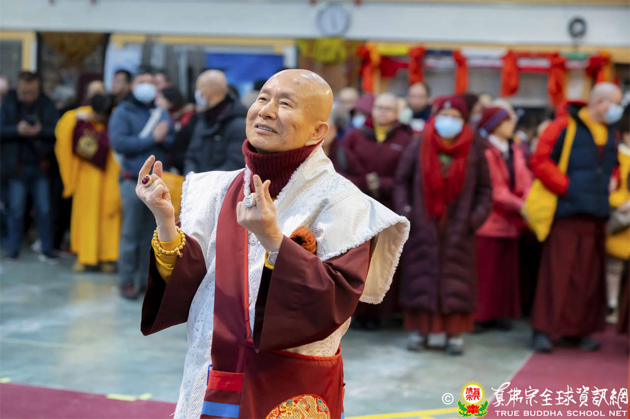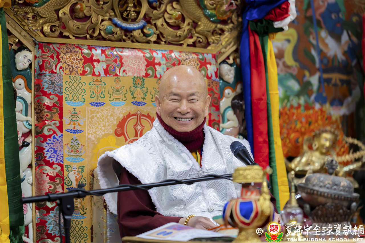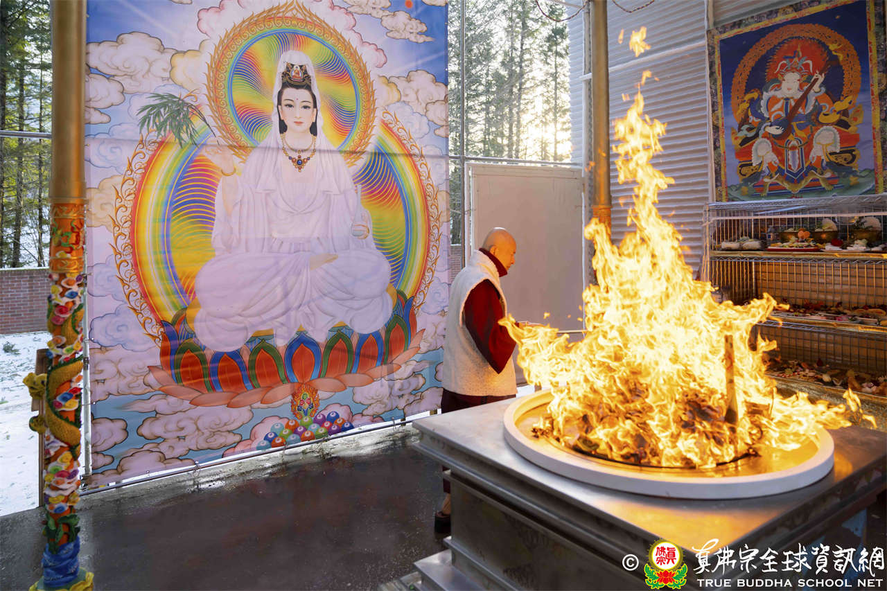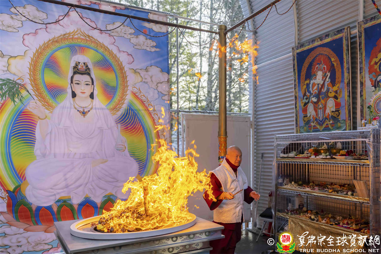 法王開示至此,護摩法會圓滿結束。接著,法王與線上的弟子打招呼,並爲現場出席者賜授觀世音菩薩法灌頂。