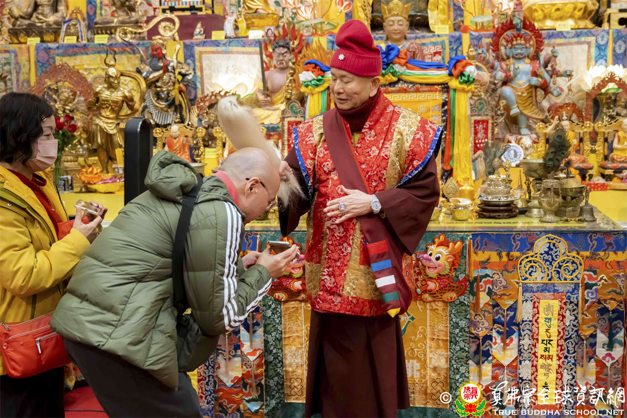 聖尊精彩的比喻與開示,讓信眾們理解到維摩詰居士的神通不可思議,大家報以熱烈的掌聲。接著法王為新皈依者做皈依灌頂,加持大悲水,並以佛塵一一加持與會大衆。