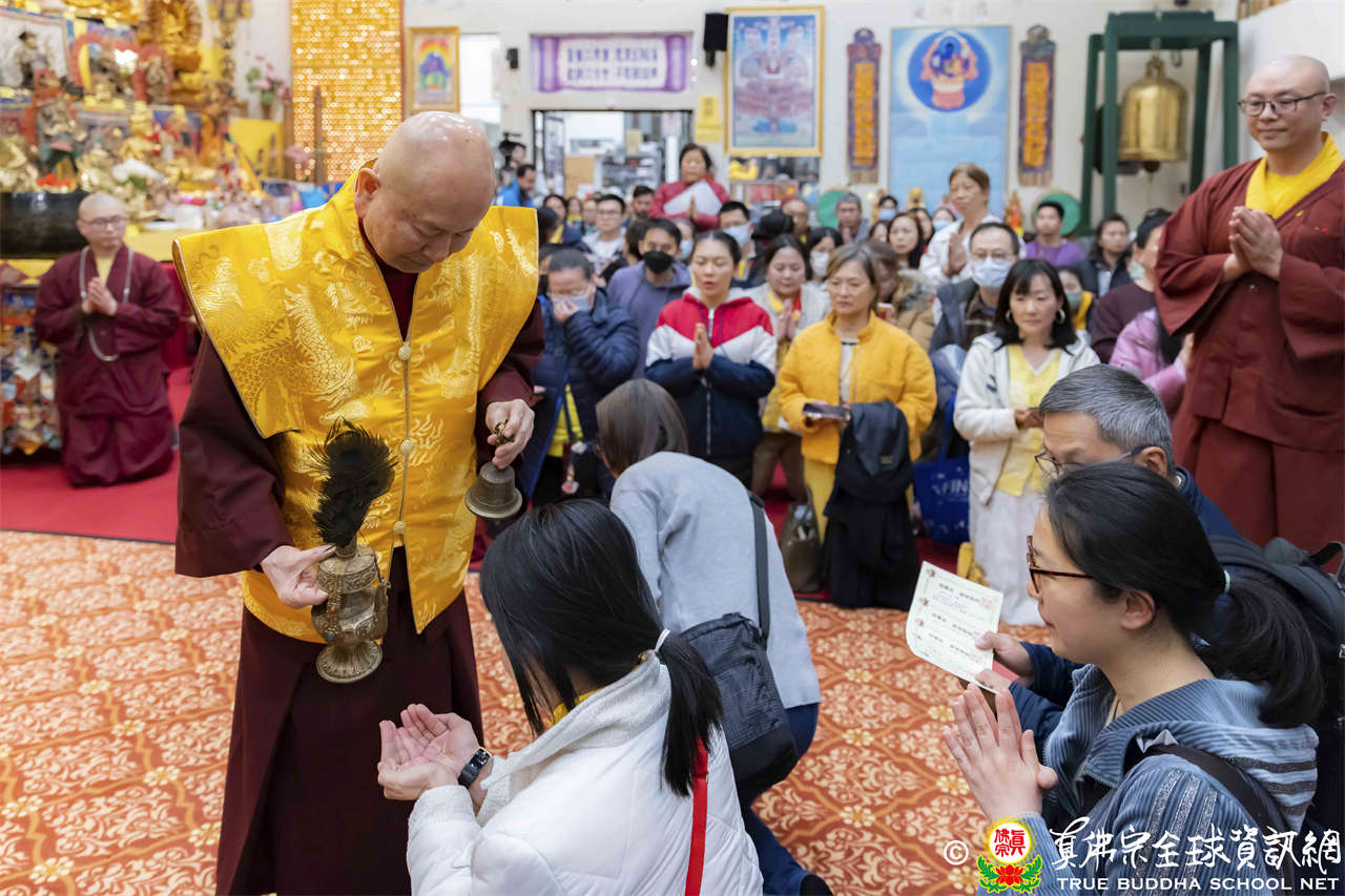 聖尊精彩寶貴的法語開示後,慈悲為新皈依弟子做皈依灌頂、加持大悲咒水、開光佛像,及持拂塵加持與會大眾。