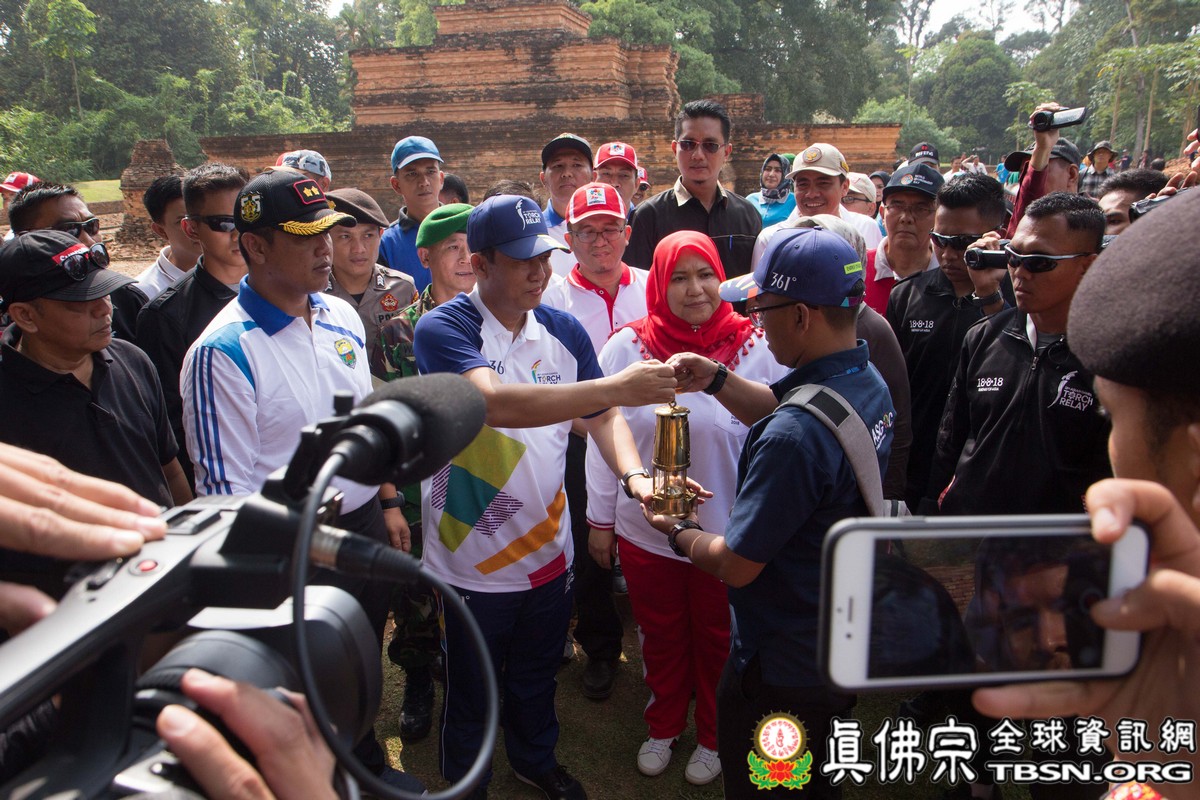 上午九時,迎賓舞及傳統音樂揭開了序幕,亞運主辦單位抵達會場,在占碑古蹟入口牌坊處,將象徵聖火的燈炬,交棒給占碑副縣長 Bambang Bayu Suseno, SP. MM. M. Si,副縣長代表接受後,前行至古蹟區內最大的聖塔,再由縣長Hj. Masnah Busyro, SE正式接下聖火,並與當地政要合影,且致詞祝福此次2018年亞運在印尼能成功圓滿的舉辦。接著,更接受來自世界各地約40個媒體的聯訪,此次亞運是印尼自1962年後,睽違超過半世紀後再次舉辦的盛會。