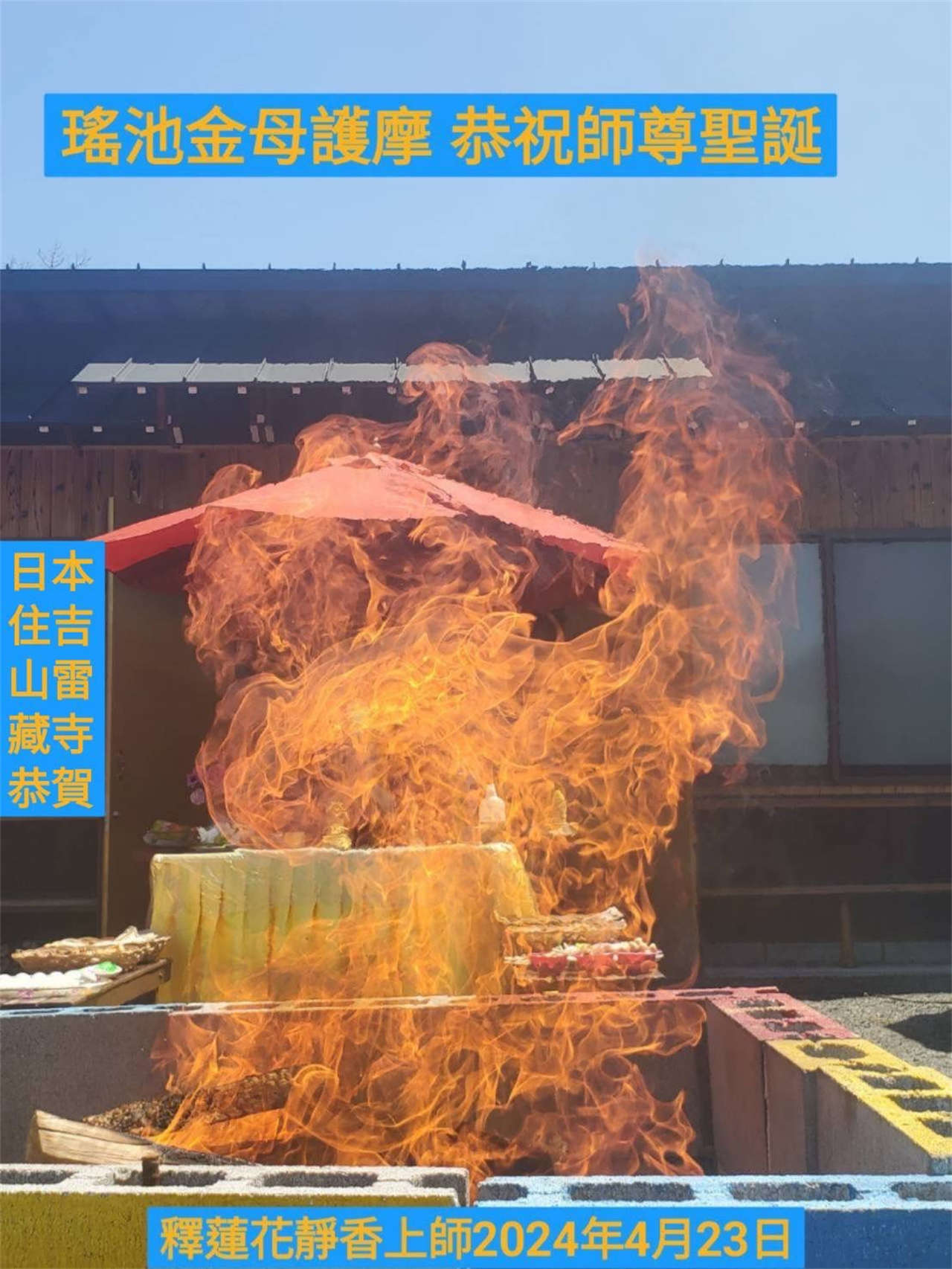 釋蓮花靜香上師於2024年4月23日在日本住吉雷藏寺主壇專壇「請佛住世瑤池金母護摩」,迴向師佛: